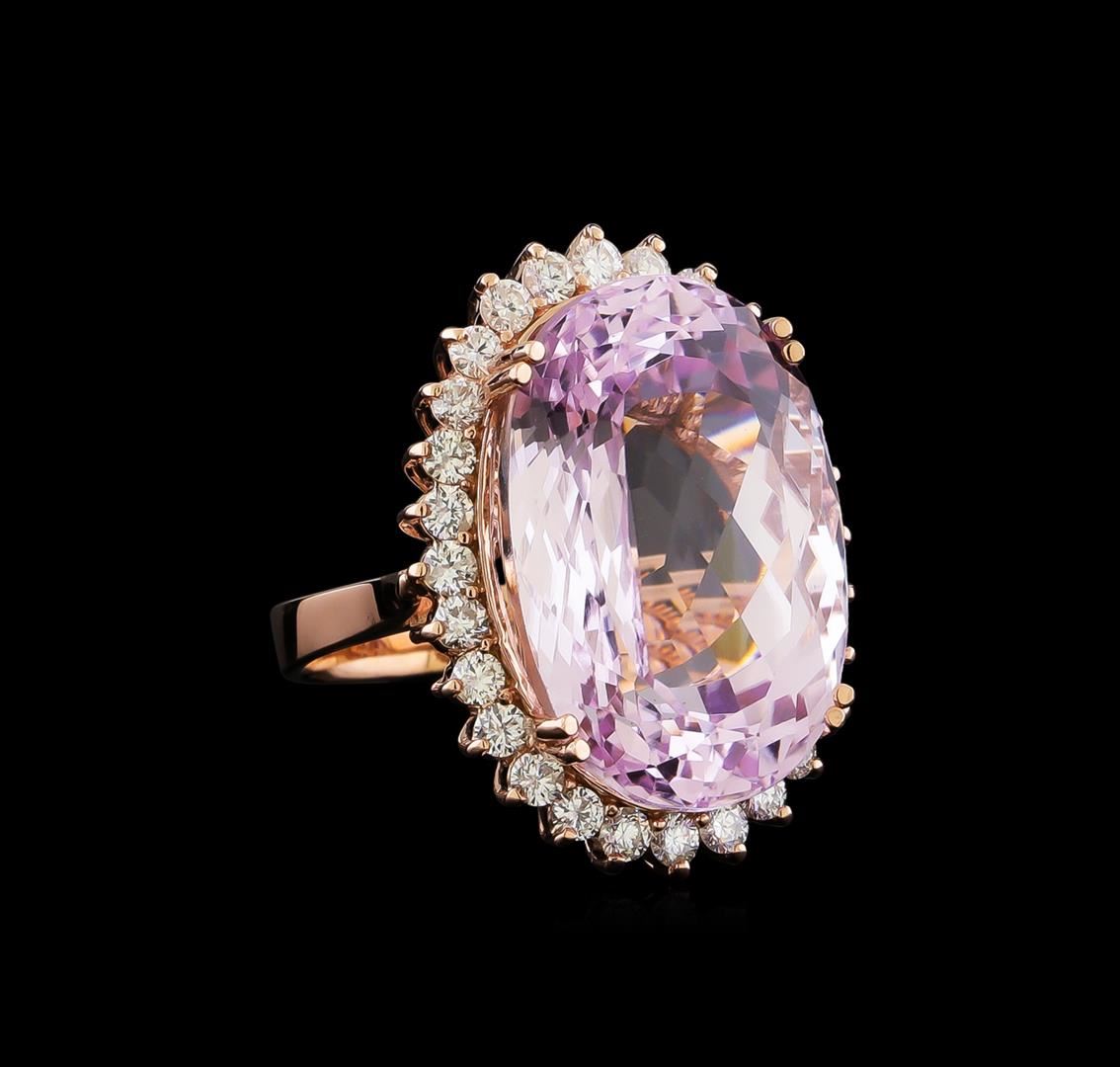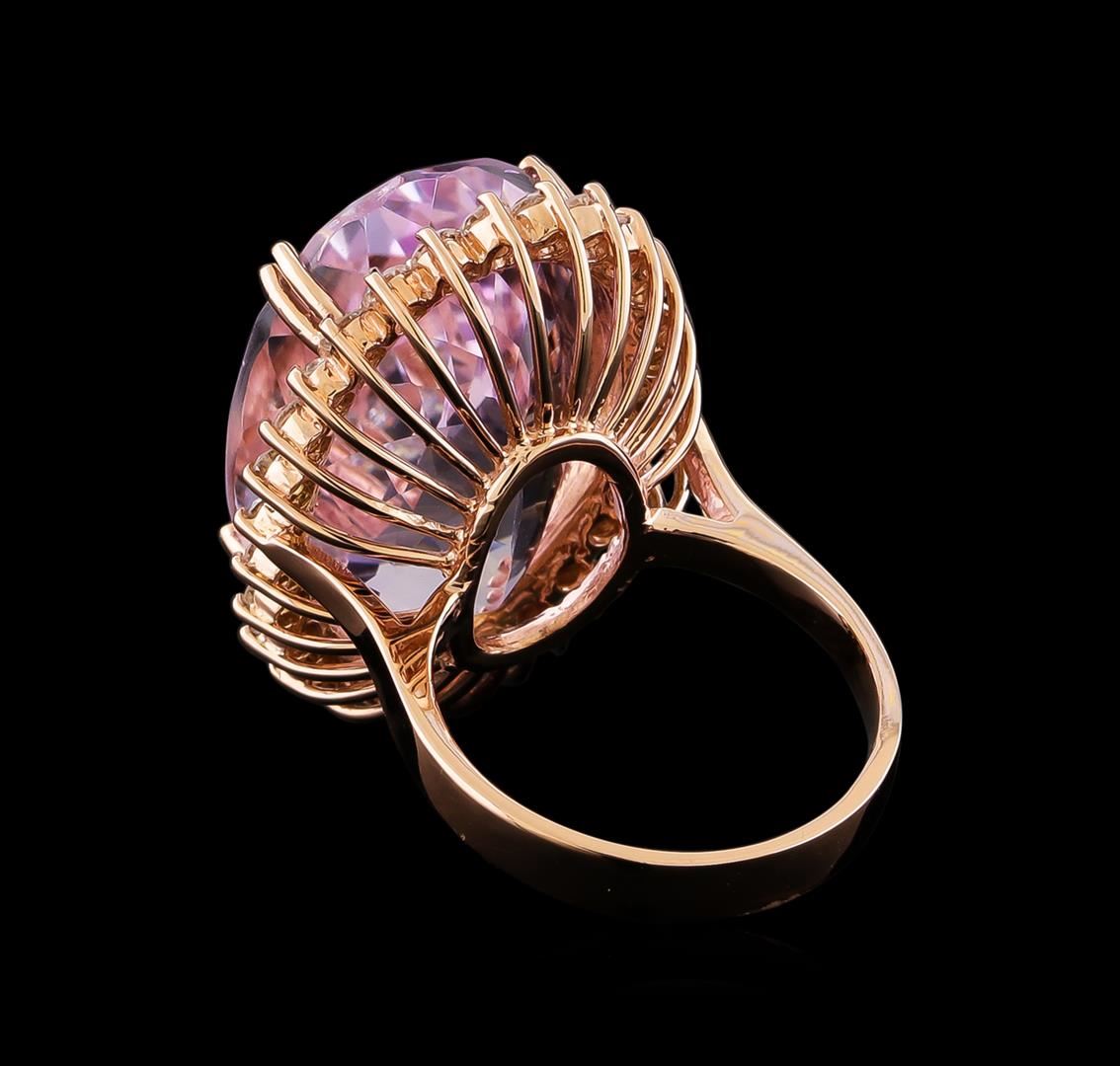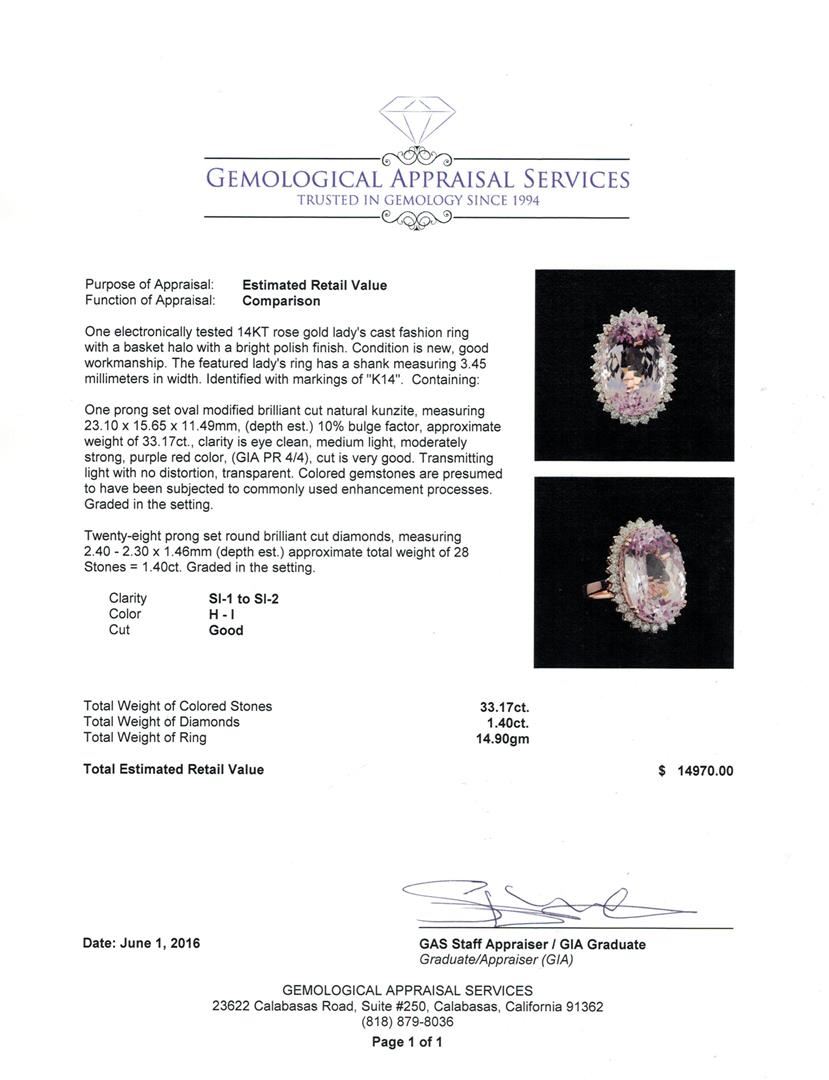 One electronically tested 14KT rose gold lady's cast fashion ring with a basket halo with a bright polish finish. The featured lady's ring has a shank measuring 3.45 millimeters in width. Identified with markings of "K14". Condition is new, good workmanship. Containing: One prong set oval modified brilliant cut natural kunzite, measuring 23.10 x 15.65 x 11.49mm, (depth est.) 10%. bulge factor, approximate weight of 33.17ct., clarity is eye clean, medium light, moderately strong, purple red color, (GIA PR 4/4), cut is very good. Transmitting light with no distortion, transparent. Colored gemstones are presumed to have been subjected to commonly used enhancement processes. Graded in the setting. Twenty-Eight prong set round brilliant cut diamonds, measuring 2.40 - 2.30 x 1.46mm (depth est.) approximate total weight of 28 Stones = 1.40ct. Graded in the setting. Clarity: SI-1 to SI-2. Color: H - I. Cut Good. Total Weight of Colored Stones 33.17ct. Total Weight of Diamonds 1.40ct. Total Weight of Ring 14.90gm. GAS Appraised at $14,970.00.