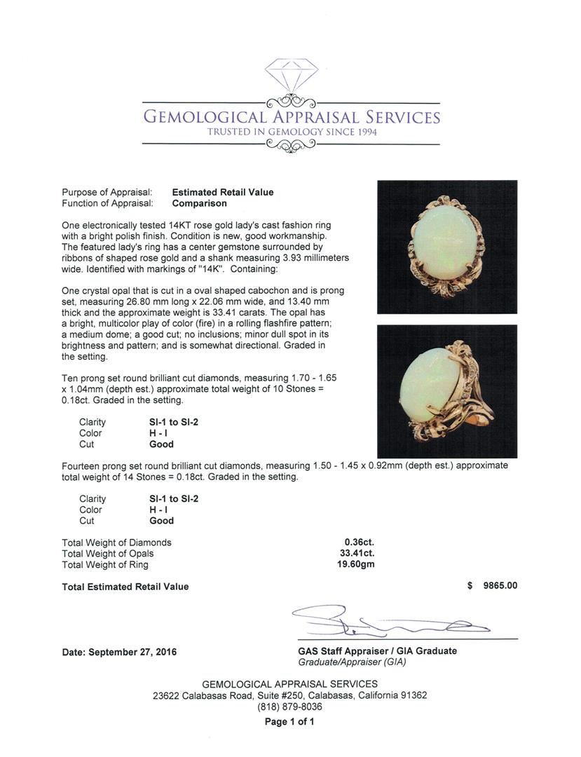 One electronically tested 14KT rose gold lady's cast fashion ring with a bright polish finish. The featured lady's ring has a center gemstone surrounded by ribbons of shaped rose gold and a shank measuring 3.93 millimeters wide. Identified with markings of '14K'. Condition is new, good workmanship. Containing: One crystal opal that is cut in a oval shaped cabochon and is prong set, measuring 26.80 mm long x 22.06 mm wide, and 13.40 mm thick and the approximate weight is 33.41 carats. The opal has a bright, multicolor play of color (fire) in a rolling flashfire pattern; a medium dome; a good cut; no inclusions; minor dull spot in its brightness and pattern; and is somewhat directional. Graded in the setting. Ten prong set round brilliant cut diamonds, measuring 1.70 - 1.65 x 1.04mm (depth est.) approximate total weight of 10 Stones = 0.18ct. Graded in the setting. Clarity SI-1 to SI-2. Color: H - I Cut Good Fourteen prong set round brilliant cut diamonds, measuring 1.50 - 1.45 x 0.92mm (depth est.) approximate total weight of 14 Stones = 0.18ct. Graded in the setting. Clarity SI-1 to SI-2. Color: H - I Cut Good. Total Weight of Diamonds 0.36ct.. Total Weight of Opals 33.41ct.. Total Weight of Ring 19.60gm. GAS Appraised at $9,865.00.