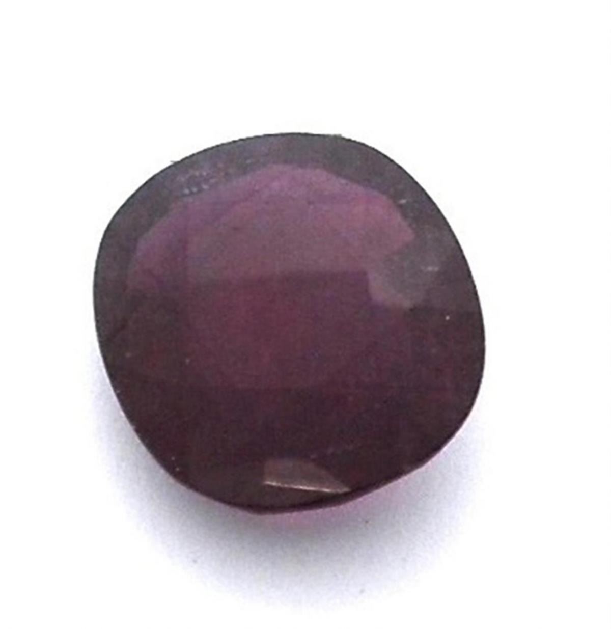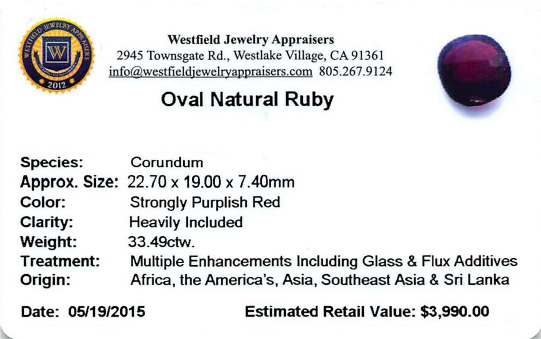 One oval mixed cut natural ruby, measuring 22.70 x 19.00 x 7.40mm, exact weight 33.49ct., clarity is heavily included, type II, dark, very slightly brownish, strongly purplish red color, (GIA stpR 7/3), cut is good. Transmitting light somewhat diffusely, translucent. Naturally occurring internal & external characteristics are present. Indications of laboratory high temperature heat treatment, with glass & flux additives. Westfield Appraised.