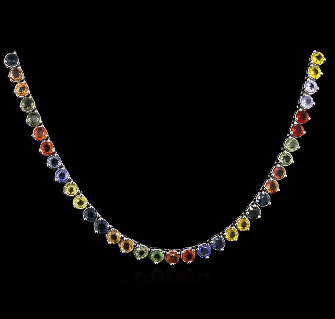 One electronically tested 14KT white gold lady's combination cast & assembled straight line tennis necklace with a tongue clasp with foldover safety with a bright polish finish. The featured lady's necklace measures 18 inches long. Identified with markings of "14K". Condition is new, good workmanship. Containing: Ninety-nine prong set round modified mixed cut natural multi-color sapphires, measuring 4.10 - 4.00 x 2.50 mm, approximate total weight of 33.50ct., clarity is moderately included, cut is good. The multi-color sapphires vary in hue from blue to green to yellow to yellowish orange to orangy Weight of Colored Stones 33.50ct. Total Weight of Necklace 44.80gm at $13440.00.. GAS Appraised at $13,440.00.