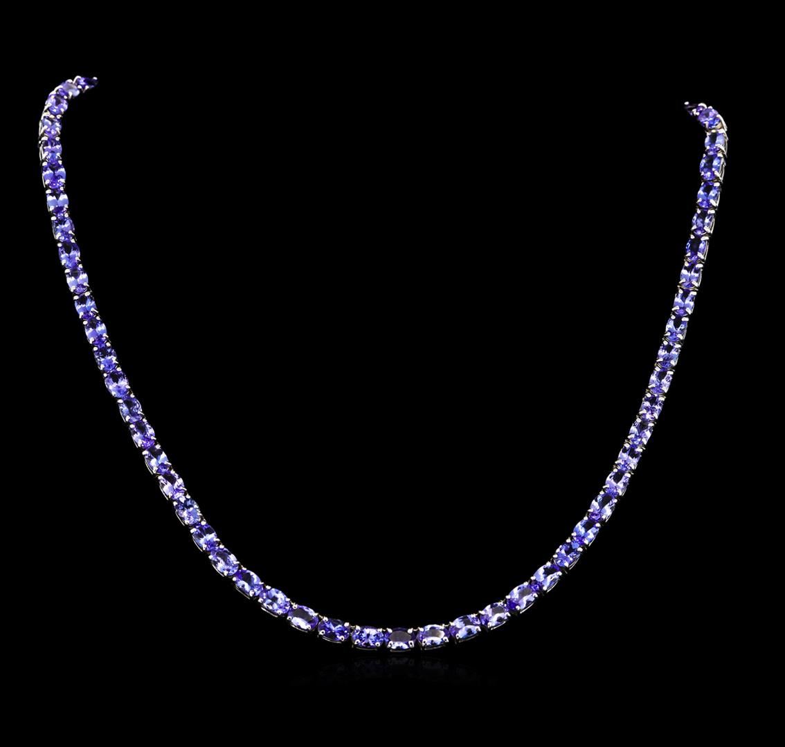 One electronically tested 14KT white gold ladies cast & assembled tanzanite necklace with a bright polish finish. The seventeen inch necklace features a continuous tanzanite ribbon terminating in a concealed clasp with safety. Identified with markings of "14K". Condition is good. Containing: Seventy-two prong set oval mixed cut natural tanzanites, measuring 6.00 x 4.00 x 2.60mm, 5%. bulge factor, approximate total weight of 33.50ct., clarity is eye clean, type I, medium, very slightly grayish, bluish violet color, (GIA bV 5/3), cut is good. Transmitting light with no distortion, transparent. Measurements & the color grade are an average for the group. Graded in the setting. Tanzanite is a very rare gemstone that is only found in the country of Tanzania. Originally discovered in 1967. Tiffany & Company, named the stone Tanzanite. It is found in the Usumburu Mountains that border the Umba Valley of northern Tanzania. Tanzanite occurs in gray, brown, violet, blue, reddish-purple, & green. The gem is interesting because of its exceptional pleochroism. Rotated in different directions a tanzanite will exhibit multiple changes of color. Tanzanite has a low tolerance to ultrasonic cleaning, and should not be cleaned using this method. Total Weight of Colored Stones 33.50ct. AIG Appraised at $24,230.00.