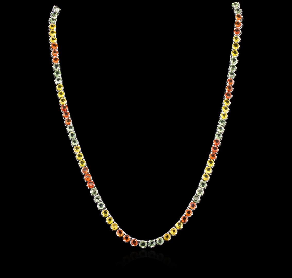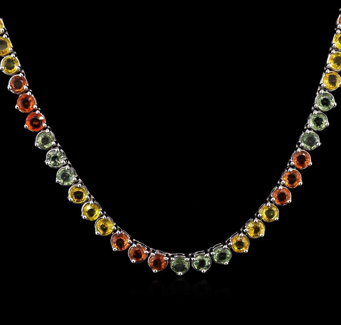 One electronically tested 14KT white gold lady's combination cast & assembled straight line tennis necklace with a tongue clasp with foldover safety with a bright polish finish. The featured lady's necklace measures 18 inches in length. Identified with markings of "14K". Condition is new, good workmanship. Containing: Ninety-nine prong set round modified mixed cut natural multi-color sapphires, measuring 4.10 - 4.00 x 2.00 mm, approximate total weight of 33.56ct., clarity is slightly included, cut is good. The multi-color sapphires vary in hue from green to yellow to orange to orangy red. Colored gemstones are presumed to have been subjected to commonly used enhancement processes. Graded in the setting. Total Weight of Colored Stones 33.56ct. Total Weight of Necklace 45.60gm at $8540.00.. GAS Appraised at $8,540.00.
