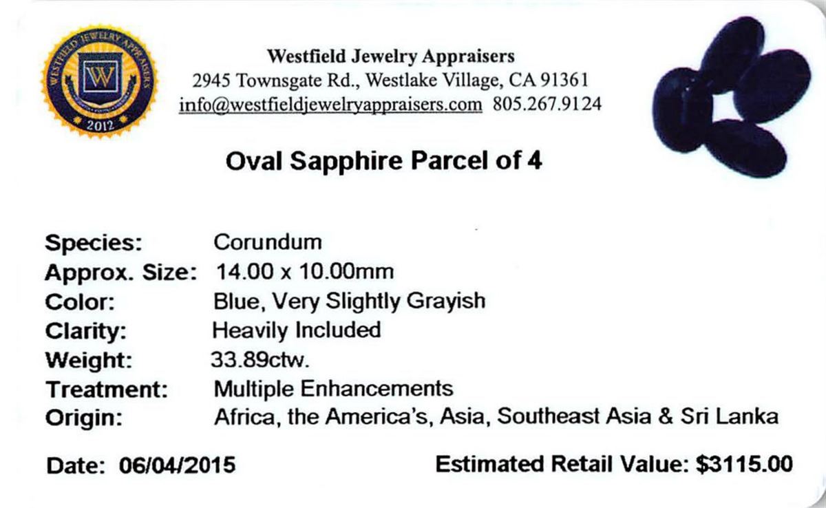 Four oval mixed cut natural blue sapphires, measuring 14.00 x 10.00 x 6.50mm, exact total weight 33.89ct., clarity is heavily included, type II, very dark, very slightly grayish, blue color, (GIA B 8/3), cut is good. Measurements are an average for the group. Transmitting light very diffusely, opaque, Naturally occurring internal & external characteristics are present, Indications of multiple laboratory enhancements, including high temperature heat treatment. Westfield Appraised at $3,115.00.