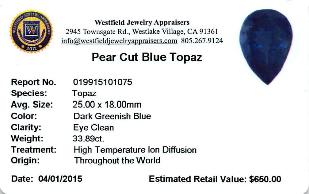 One pear cut natural blue topaz exact weight 33.89ct., clarity is eye clean, type I, dark, very slightly grayish, greenish blue color, (GIA gB 7/3), cut is good. Westfield Appraised at $650.00.