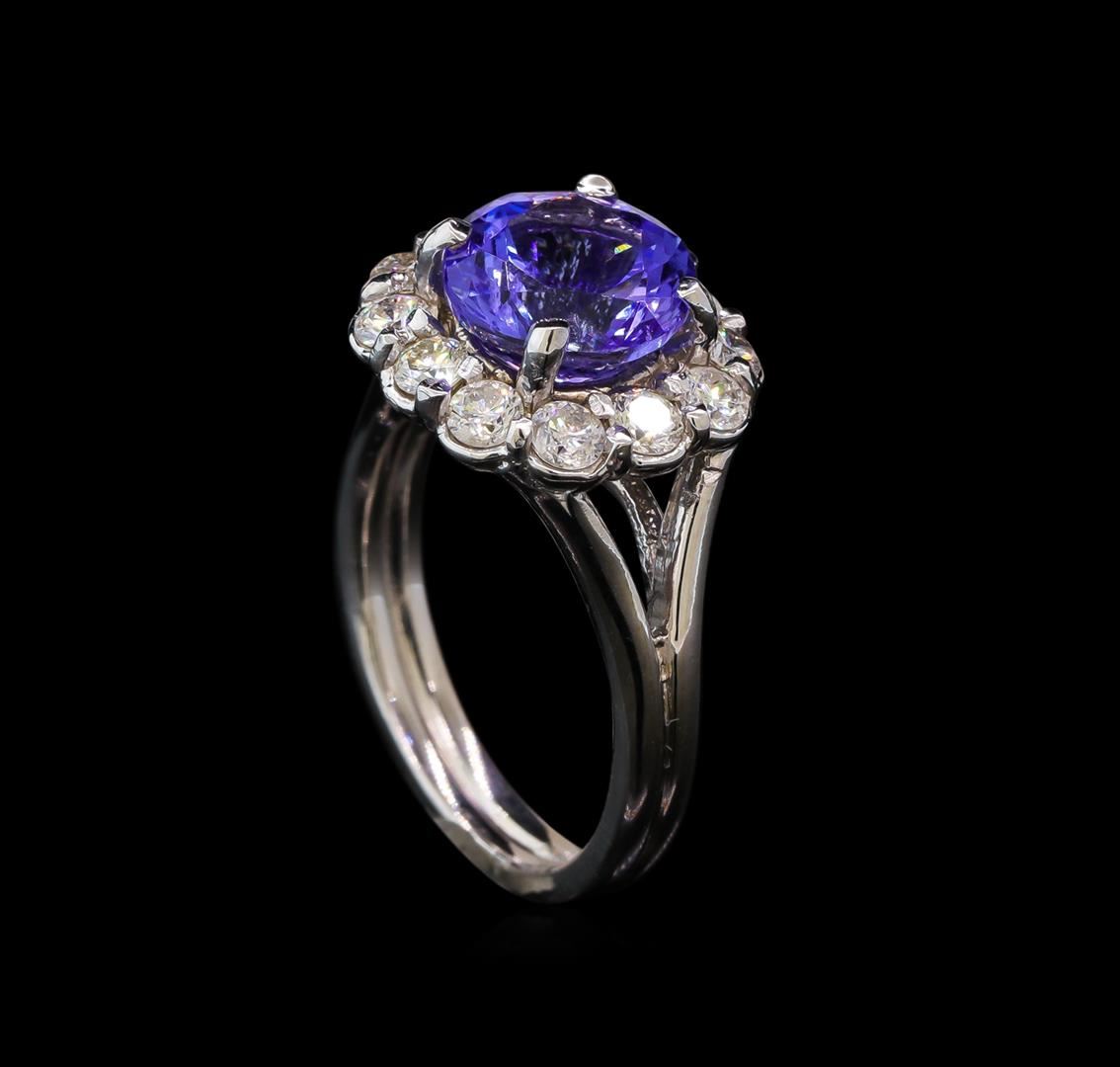 One electronically tested 14KT white gold lady's cast fashion ring with a split shank scalloped basket halo with a bright polish finish. The featured lady's ring has a double shank measuring 3.15 millimeters wide. Identified with markings of '14K'. Condition is new, good workmanship. Containing: One prong set round modified mixed cut natural tanzanite, measuring 9.13 - 9.08 x 6.43 mm, (depth est.) approximate weight of 3.39ct., clarity is slightly included, medium, moderately strong, violetish blue color, (GIA vB 5/4), cut is good. Transmitting light with no distortion, transparent. Colored gemstones are presumed to have been subjected to commonly used enhancement processes. Graded in the setting. Twelve prong set round brilliant cut diamonds, measuring 2.80 - 2.75 x 1.72mm (depth est.) approximate total weight of 12 Stones = 0.98ct. Graded in the setting. Clarity SI-1 to I-1. Color: H - I Cut Good. Total Weight of Colored Stones 3.39ct.. Total Weight of Diamonds 0.98ct.. Total Weight of Ring 7.20gm GAS Appraised at $8,225.00.