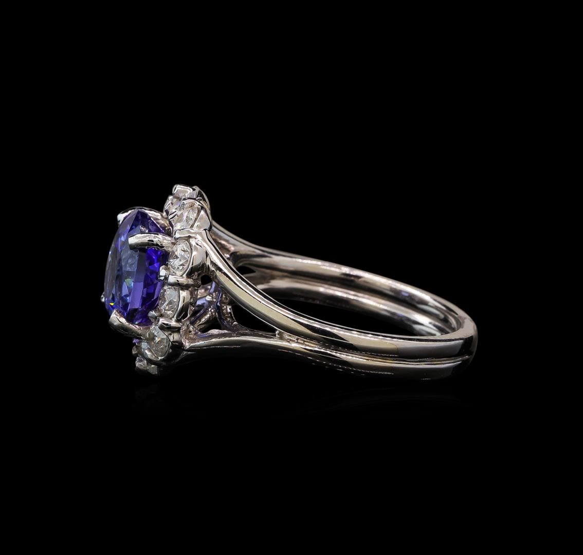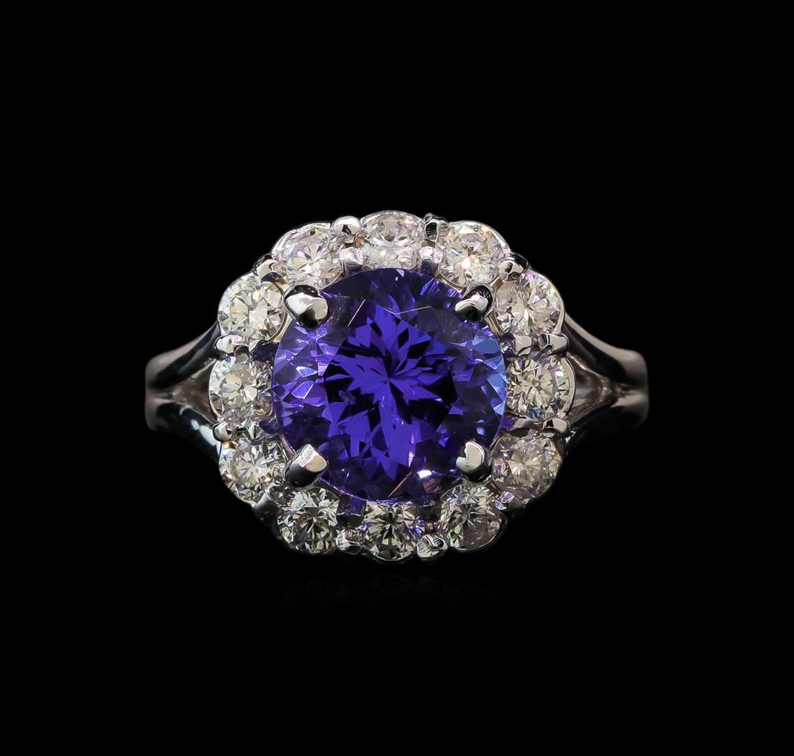One electronically tested 14KT white gold lady's cast fashion ring with a split shank scalloped basket halo with a bright polish finish. The featured lady's ring has a double shank measuring 3.15 millimeters wide. Identified with markings of '14K'. Condition is new, good workmanship. Containing: One prong set round modified mixed cut natural tanzanite, measuring 9.13 - 9.08 x 6.43 mm, (depth est.) approximate weight of 3.39ct., clarity is slightly included, medium, moderately strong, violetish blue color, (GIA vB 5/4), cut is good. Transmitting light with no distortion, transparent. Colored gemstones are presumed to have been subjected to commonly used enhancement processes. Graded in the setting. Twelve prong set round brilliant cut diamonds, measuring 2.80 - 2.75 x 1.72mm (depth est.) approximate total weight of 12 Stones = 0.98ct. Graded in the setting. Clarity SI-1 to I-1. Color: H - I Cut Good. Total Weight of Colored Stones 3.39ct.. Total Weight of Diamonds 0.98ct.. Total Weight of Ring 7.20gm GAS Appraised at $8,225.00.