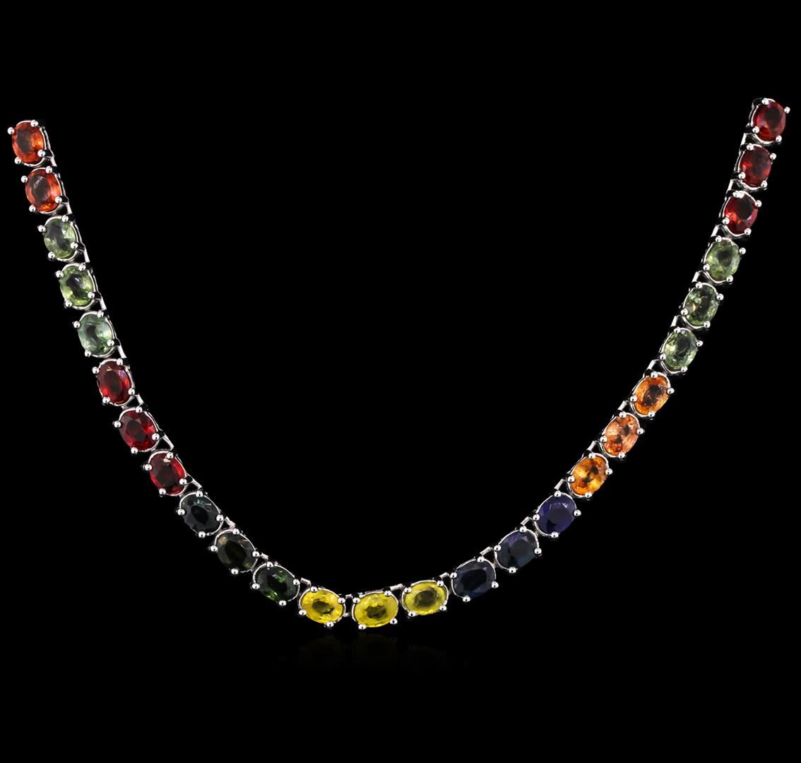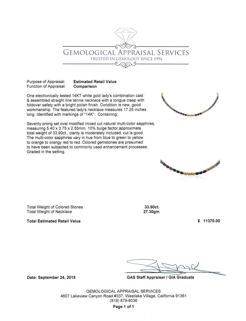 One electronically tested 14KT white gold lady's combination cast & assembled straight line tennis necklace with a tongue clasp with foldover safety with a bright polish finish. The featured lady's necklace measures 17.25 inches long. Identified with markings of "14K". Condition is new, good workmanship. Containing: Seventy prong set oval modified mixed cut natural multi-color sapphires, measuring 5.40 x 3.75 x 2.55mm, 10% bulge factor, approximate total weight of 33.90ct., clarity is moderately included, cut is good. The multi-color sapphires vary in hue from blue to green to yellow to orange to orangy red to red. Colored gemstones are presumed to have been subjected to commonly used enhancement processes. Graded in the setting. Total Weight of Colored Stones 33.90ct. Total Weight of Necklace 27.30gm at $11370.00.. GAS Appraised at $11,370.00.