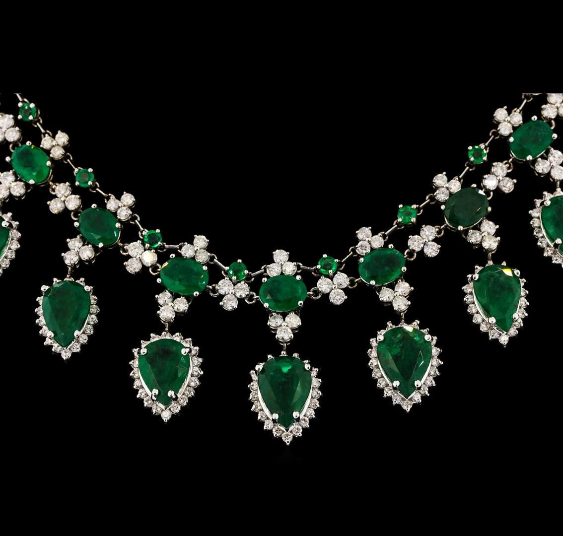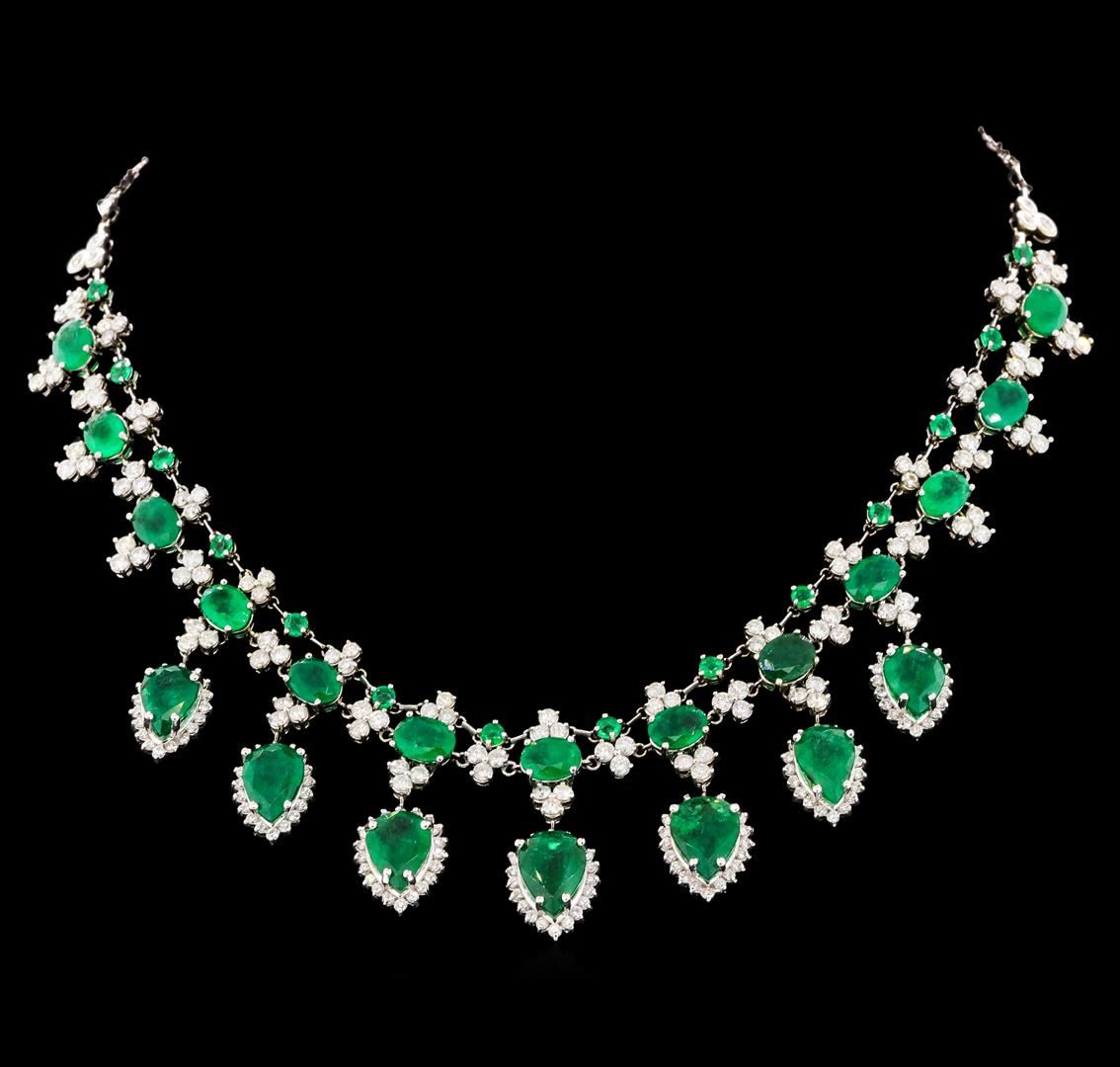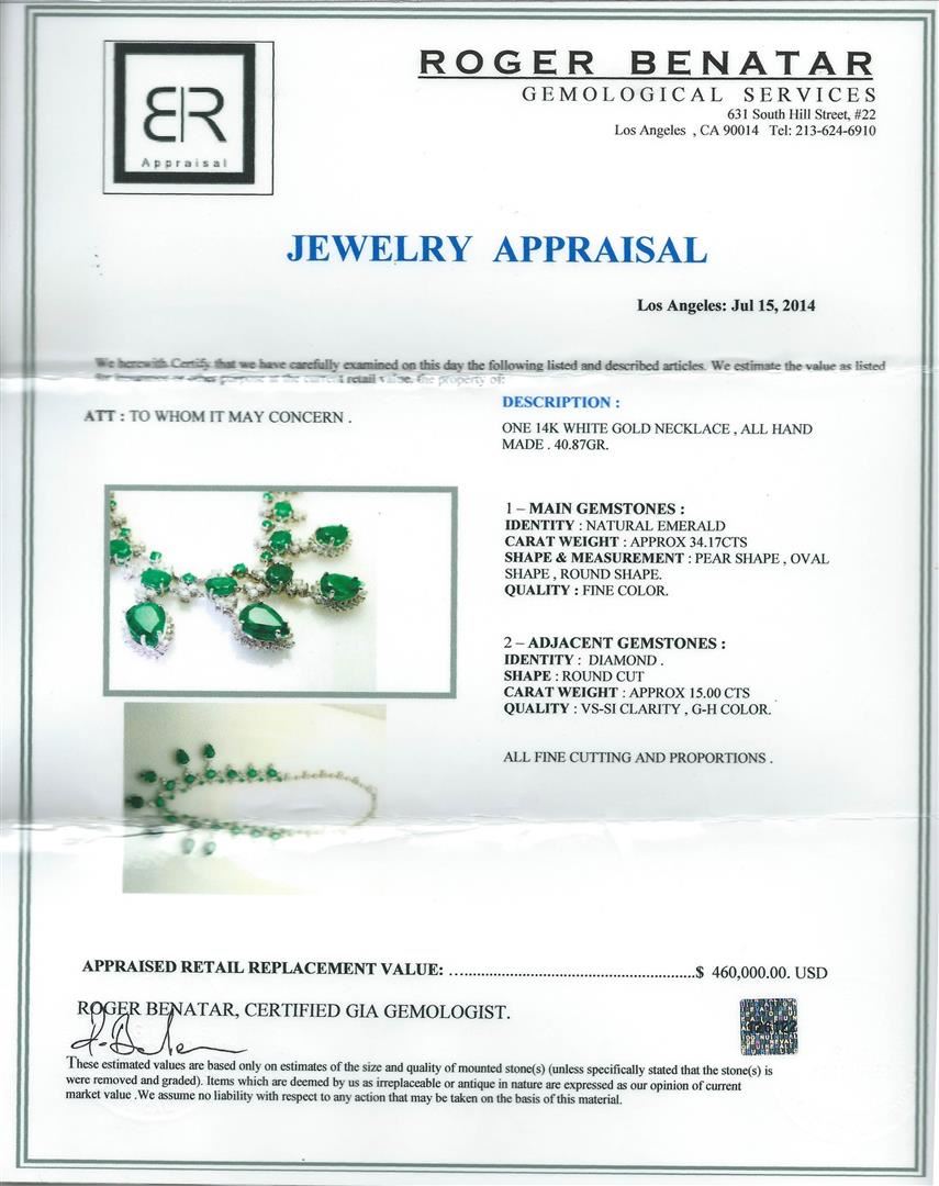 One electronically tested 14KT white gold necklace weighing 40.87 grams including pear shape natural emeralds with a total weight of 34.17ctw and round cut diamonds weighing 15.00ctw. VS-SI clarity, G-H color. All fine cutting and proportions. RBGS Appraised at $460,000.00.