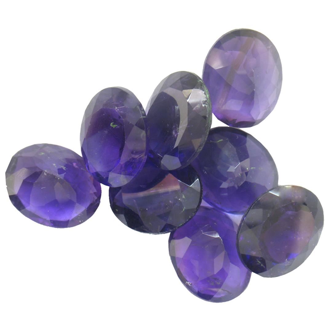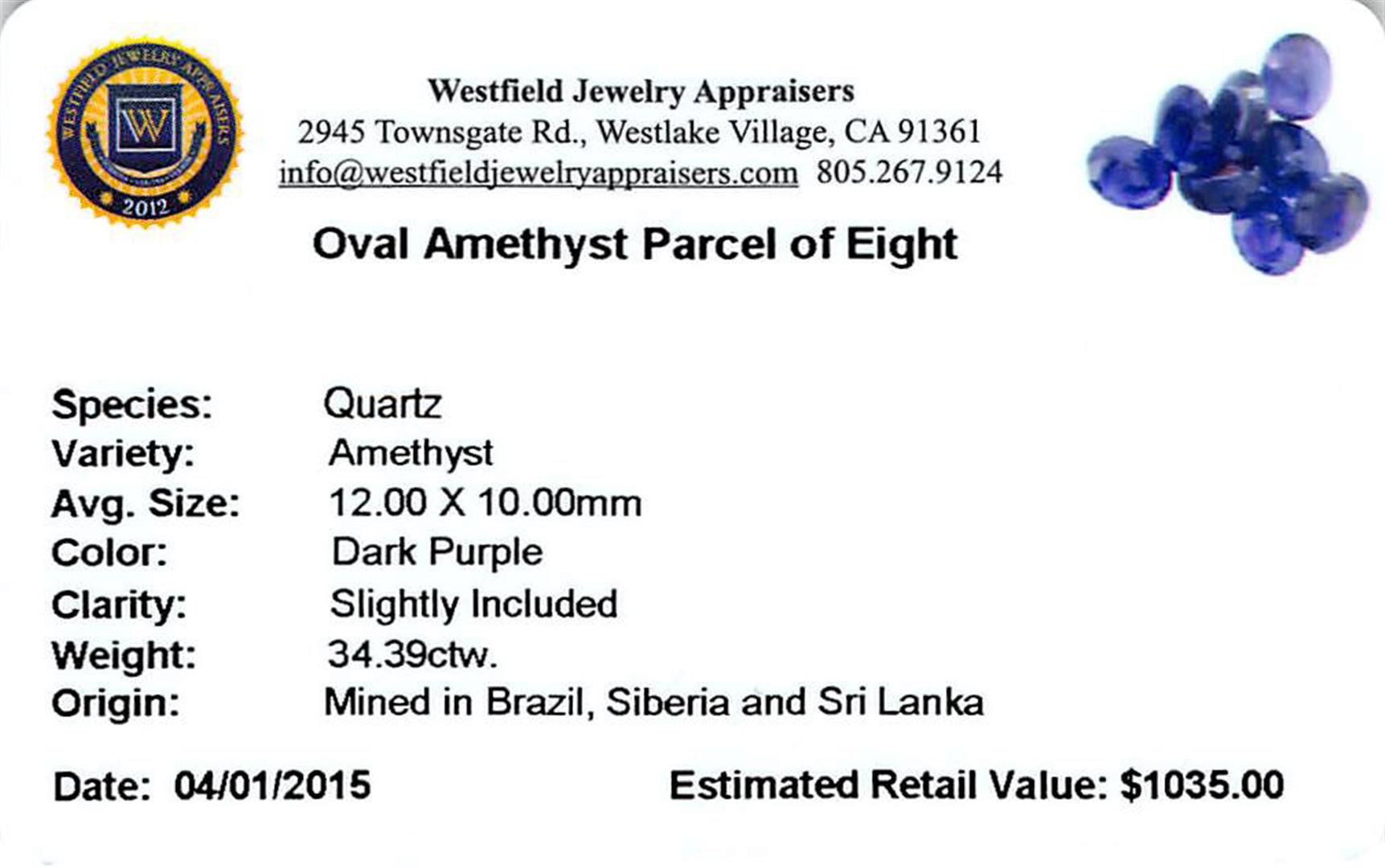 Eight oval mixed cut natural amethysts exact total weight 34.39ct., clarity is slightly included, type II, dark, very slightly grayish, purple color, (GIA P 7/3), cut is good. Westfield Appraised at $1,035.00.