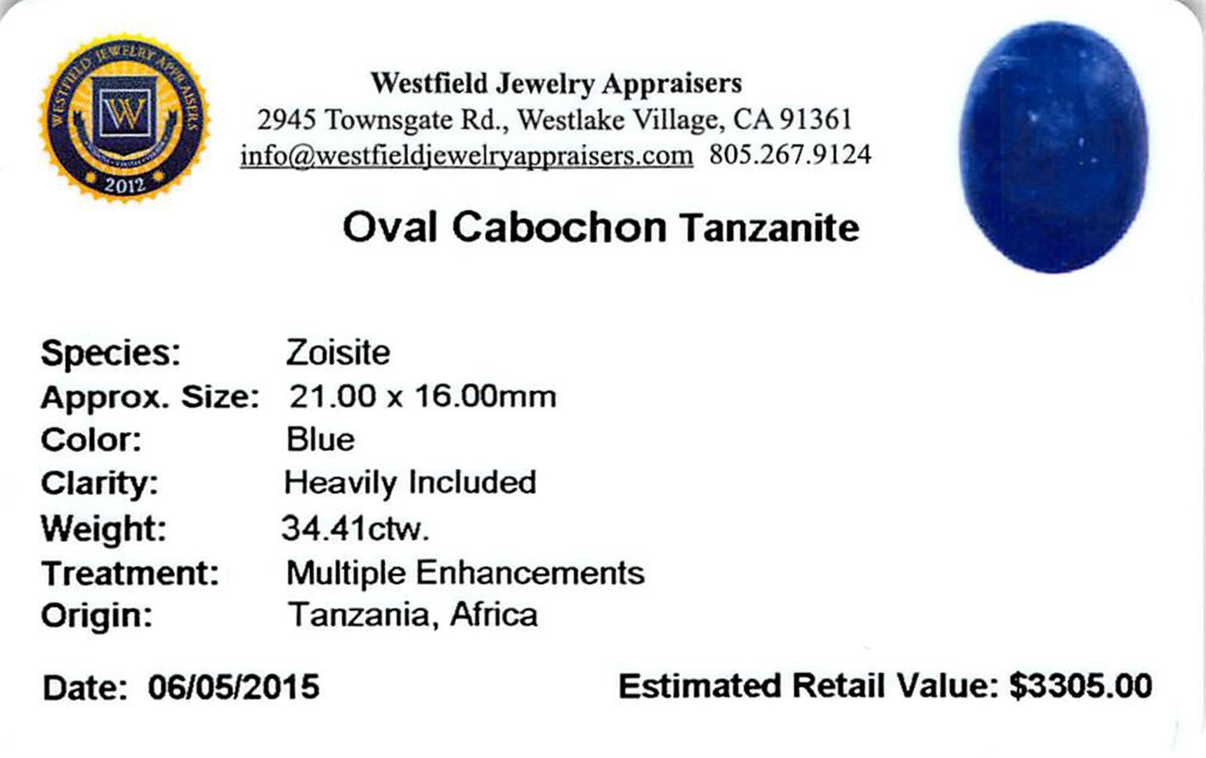 One oval cabochon cut natural tanzanite, measuring 21.00 x 16.00 x 10.00mm, exact weight 34.41ct., clarity is heavily included, type I, dark, very slightly grayish, blue color, (GIA B 7/3), cut is good. Transmitting light somewhat diffusely, transparent to translucent. Naturally occurring internal & external characteristics are present. Indications of heat treatment. Westfield Appraised.