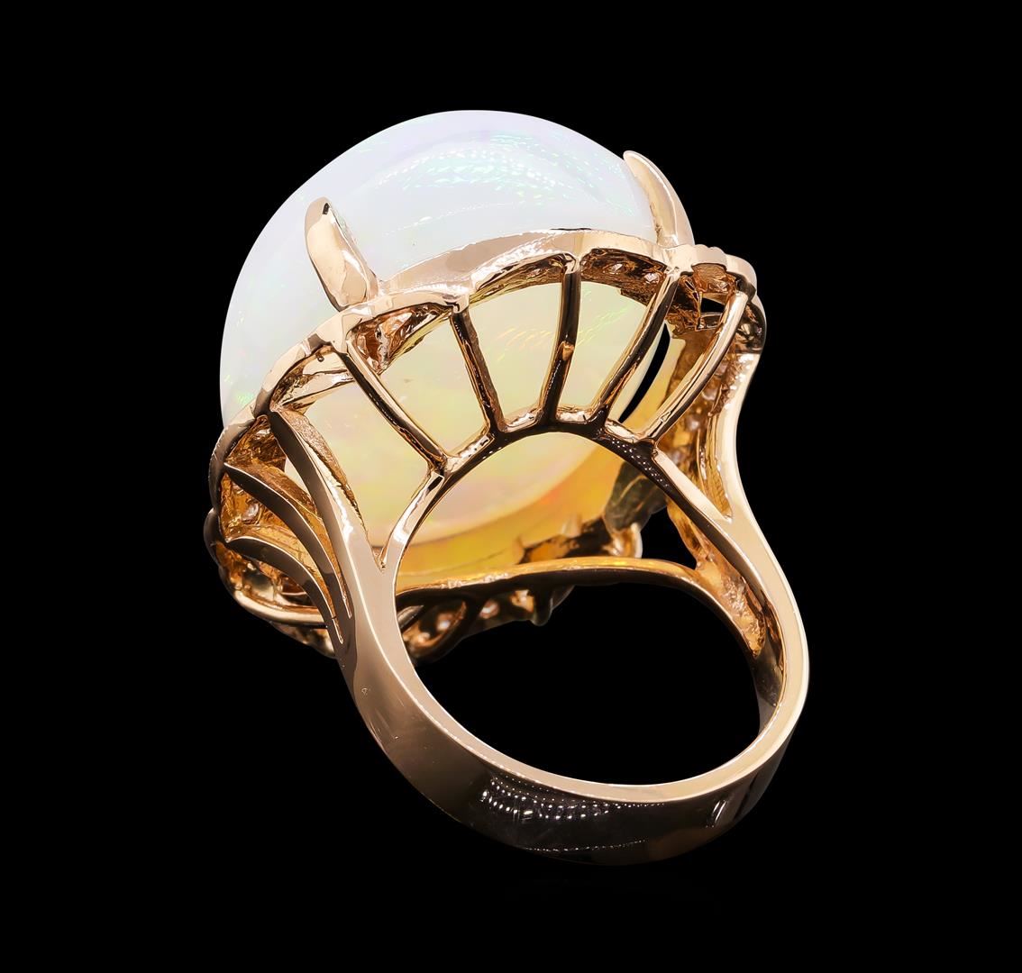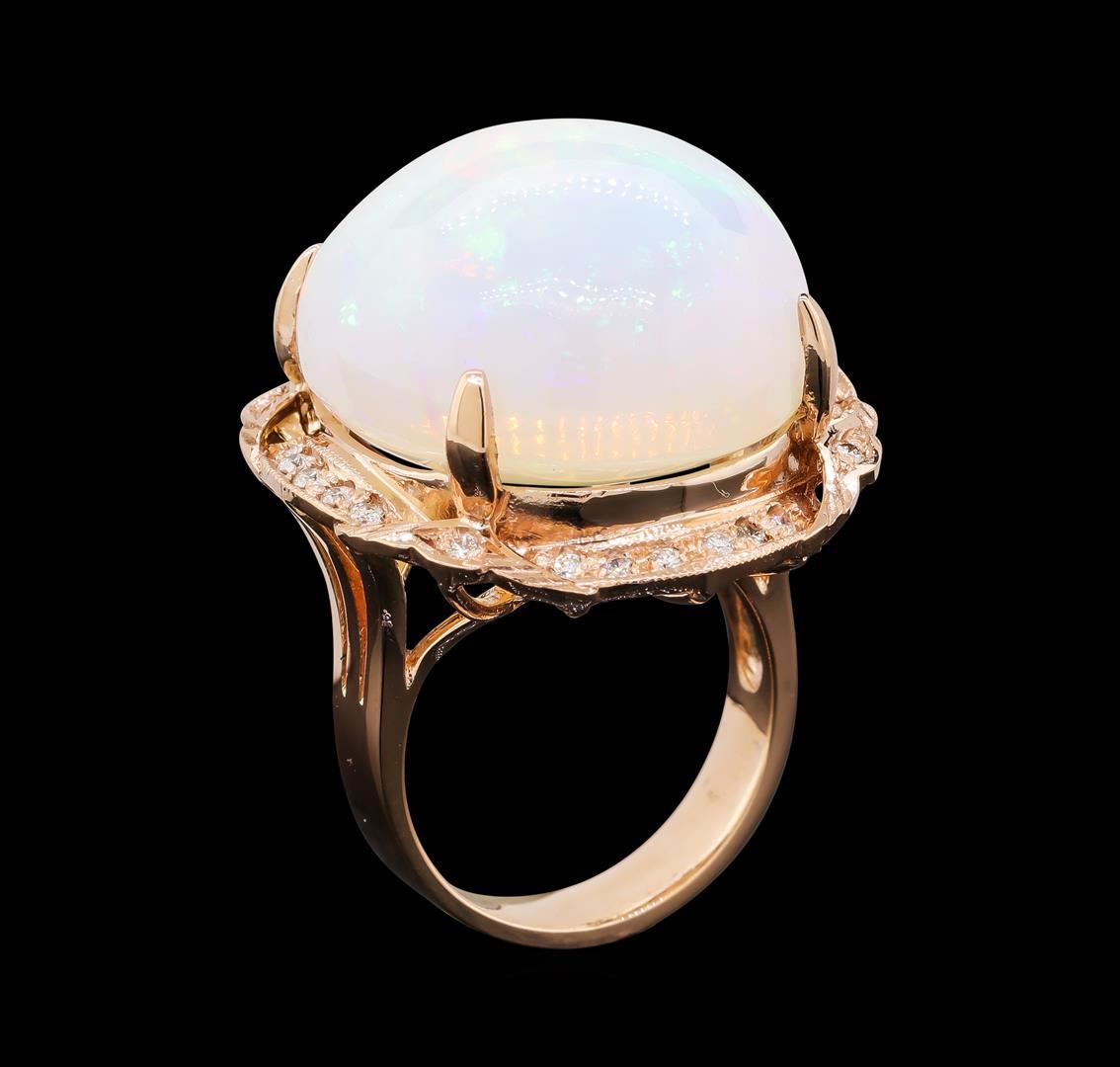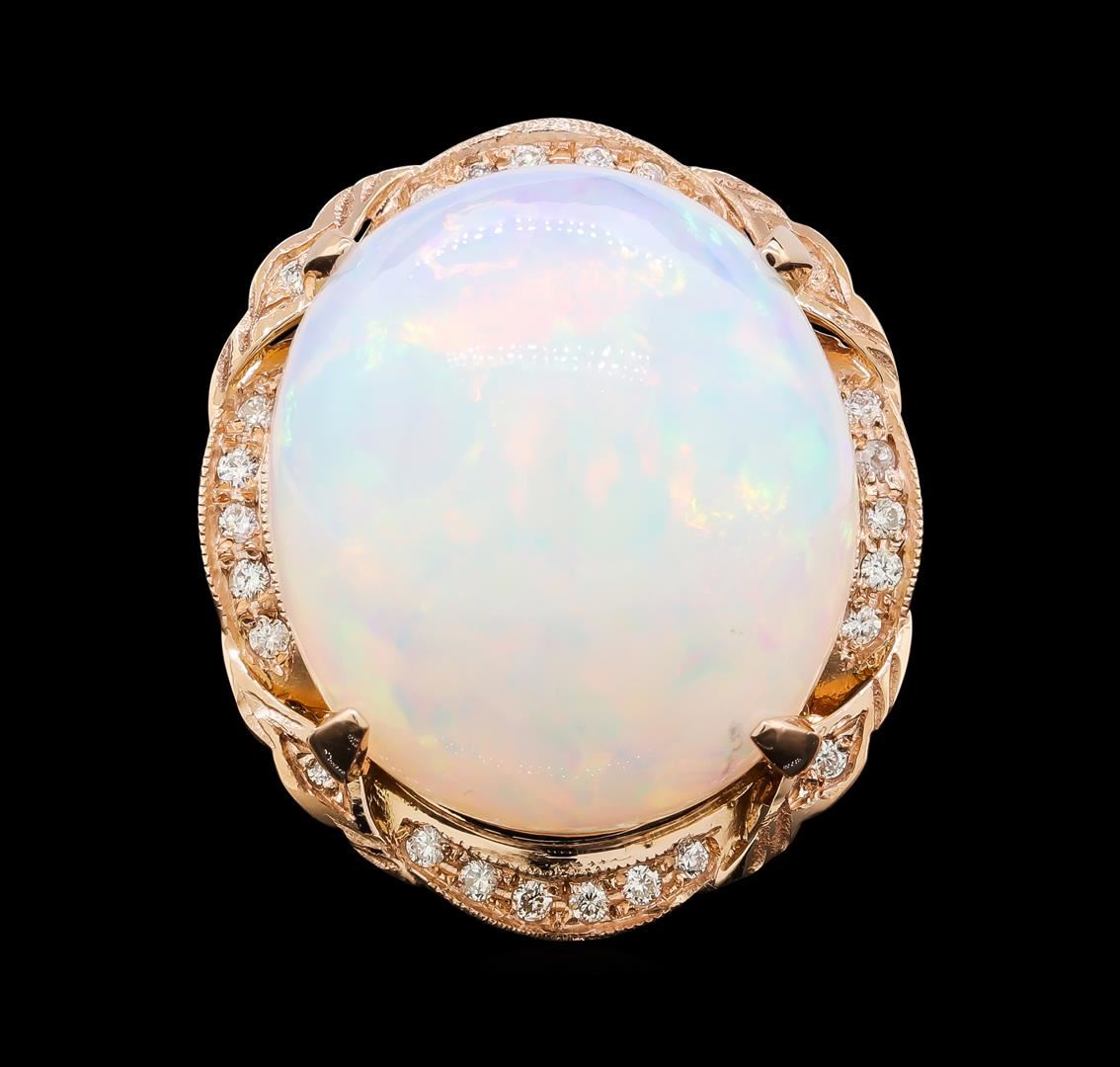 One electronically tested 14KT rose gold lady's cast fashion ring with a scalloped basket halo with a bright polish with milgrain detailing finish. The featured lady's ring has a shank measuring 4.55 millimeters wide. Identified with markings of '14K'. Condition is new, good workmanship. Containing: One crystal opal that is cut in a oval shaped cabochon and is prong set, measuring 23.80 mm long x 21.03 mm wide, and 14.50 mm thick and the approximate weight is 34.43 carats. The opal has a very bright, red-blue multicolor play of color (fire) in a rolling flashfire pattern; a high dome; a good cut; no inclusions; minor dull spot in its brightness and pattern; and is slightly directional. Graded in the setting. Twenty-Six prong set round brilliant cut diamonds, measuring 1.55 - 1.45 x 0.93mm (depth est.) approximate total weight of 26 Stones = 0.34ct. Graded in the setting. Clarity SI-1 to SI-2. Color: H - I Cut Good. Total Weight of Diamonds 0.34ct.. Total Weight of Opals 34.43ct.. Total Weight of Ring 17.20gm. GAS Appraised at $14,750.00.