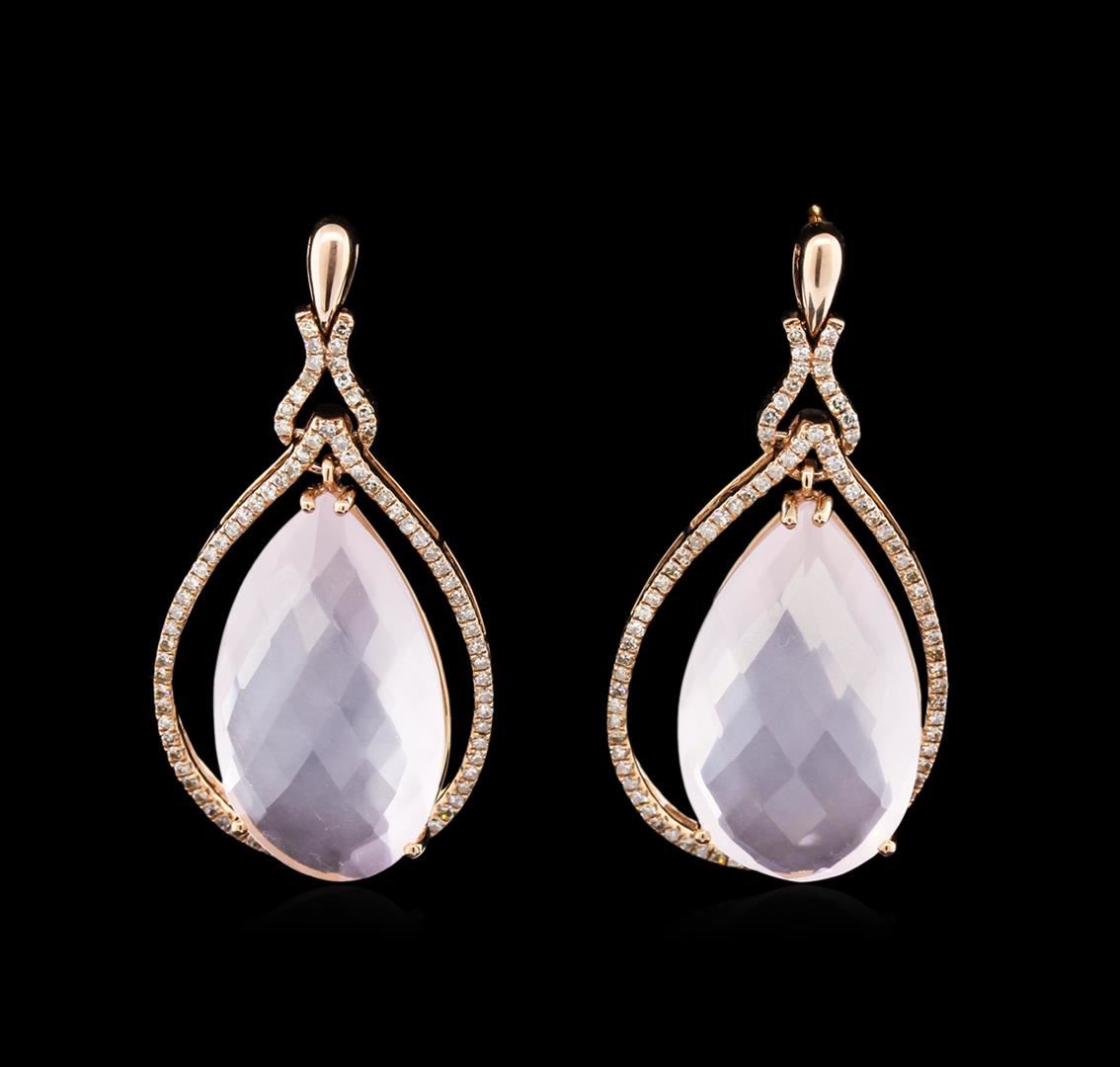 One pair electronically tested 14KT rose gold ladies cast & assembled rose quartz and diamond dangle earrings with 14KT yellow gold standard backs. Bright polish finish. Identified with markings of "14K". Condition is new, good workmanship. Containing: Two prong set pear mixed cut natural rose quartz's, measuring 26.05 x 15.05 x 7.80mm, 6%. bulge factor, approximate total weight of 34.48ct., clarity is slightly included, light, very slightly grayish, pink color, (GIA Pk 3/3), cut is good. Transmitting light somewhat diffusely, transparent to translucent. Naturally occurring internal & external characteristics are present. Measurements & the color grade are an average for the pair. Graded in the setting. One Hundred Sixty-Four prong set single cut diamonds, measuring 1.00 - 0.90 x 0.57mm (depth est.) approximate total weight of 164 Stones = 0.58ct. Graded in the setting. Clarity: SI-1 to I-1. Color: H - J. Total Weight of Colored Stones 34.48ct. Total Weight of Diamonds 0.58ct. Total Weight of Earrings 12.99gm. AIG Appraised at $3,760.00.