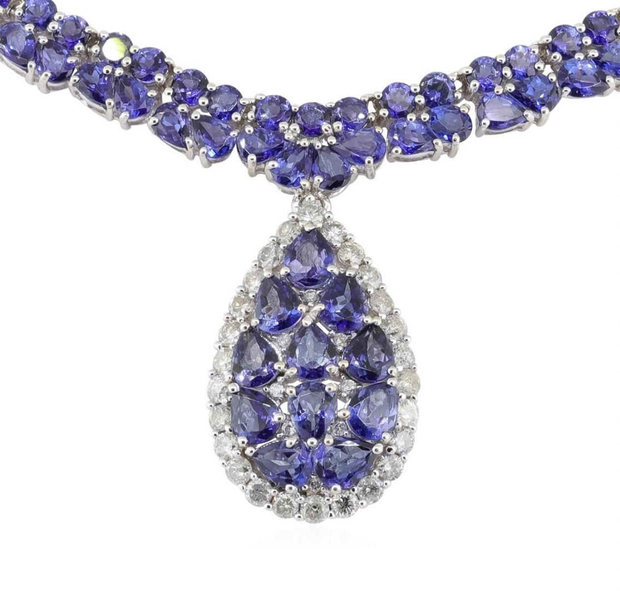 One electronically tested 14KT white gold ladies cast & assembled tanzanite and diamond necklace with a bright polish finish. Seventeen and one-half inch length necklace features a tanzanite and diamond pendant, supported by a ribbon of tanzanite and completed by a concealed clasp with twin safeties. Trademark is Orianne. Identified with markings of "14K". Condition is new, good workmanship. Containing: Two hundred sixty-six prong set round and pear mixed cut natural tanzanites approximate total weight of 34.55ct., clarity is eye clean, type I, medium dark, moderately strong, bluish violet color, (GIA bV 6/4), cut is good. Transmitting light with no distortion, transparent. Color grade is an average for the group. Graded in the setting.Tanzanite is a very rare gemstone that is only found in the country of Tanzania. Originally discovered in 1967. Tiffany & Company, named the stone Tanzanite. It is found in the Usumburu Mountains that border the Umba Valley of northern Tanzania. Tanzanite occurs in gray, brown, violet, blue, reddish-purple, & green. The gem is interesting because of its exceptional pleochroism. Rotated in different directions a tanzanite will exhibit multiple changes of color. Tanzanite has a low tolerance to ultrasonic cleaning, and should not be cleaned using this method. Thirty-Four prong set round brilliant cut diamonds, measuring 2.20 - 1.20 x 1.02mm (depth est.) approximate total weight of 34 Stones = 1.17ct. Graded in the setting. Clarity I-1 to I-2 Color G - I Total Weight of Colored Stones 34.55 ct. Total Weight of Diamonds 1.17 ct. Estimated Retail Value $ 34,000.00 US