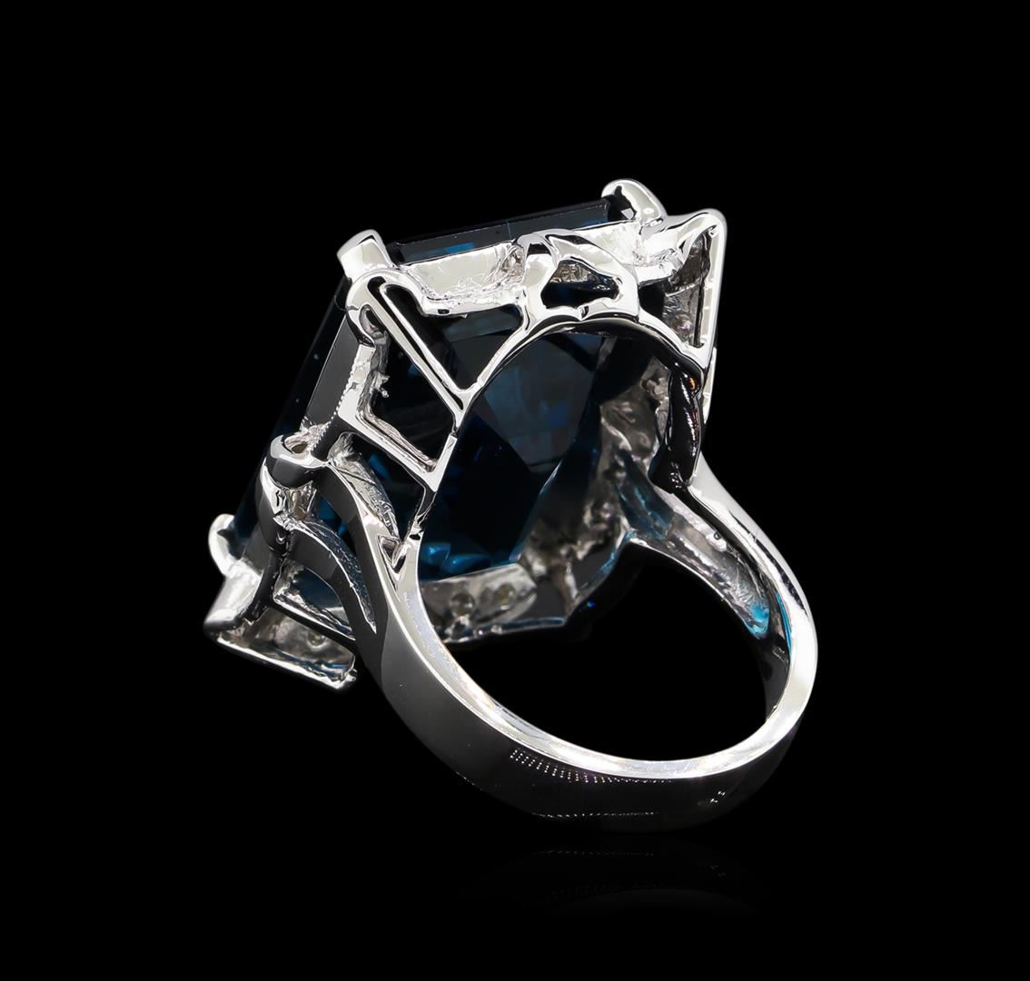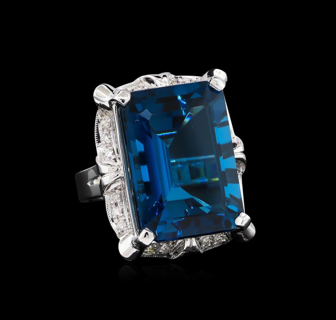 One electronically tested 14KT white gold lady's cast fashion ring with a split shank halo with a bright polish with milgrain detailing finish. The featured lady's ring has a shank measuring 4.14 millimeters wide. Identified with markings of "14K". Condition is new, good workmanship. Containing: One prong set emerald step cut natural blue topaz, measuring 21.70 x 15.88 x 10.76mm, approximate weight of 34.56ct., clarity is eye clean, type I, medium dark, moderately strong, blue color, (GIA B 6/4), cut is good. Transmitting light with no distortion, transparent. Colored gemstones are presumed to have been subjected to commonly used enhancement processes. Graded in the setting. Twenty prong set round brilliant cut diamonds, measuring 1.60 - 1.55 x 0.98mm (depth est.) approximate total weight of 20 Stones = 0.30ct. Graded in the setting. Clarity: SI-1 to I-1. Color: H - I. Cut Good. Total Weight of Colored Stones 34.56ct. Total Weight of Diamonds 0.30ct. Total Weight of Ring 16.20gm. GAS Appraised at $4,820.00.