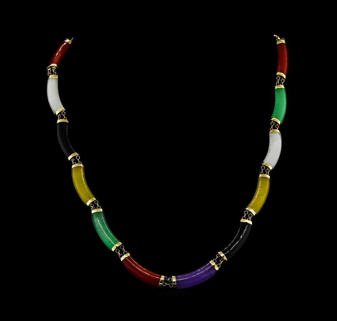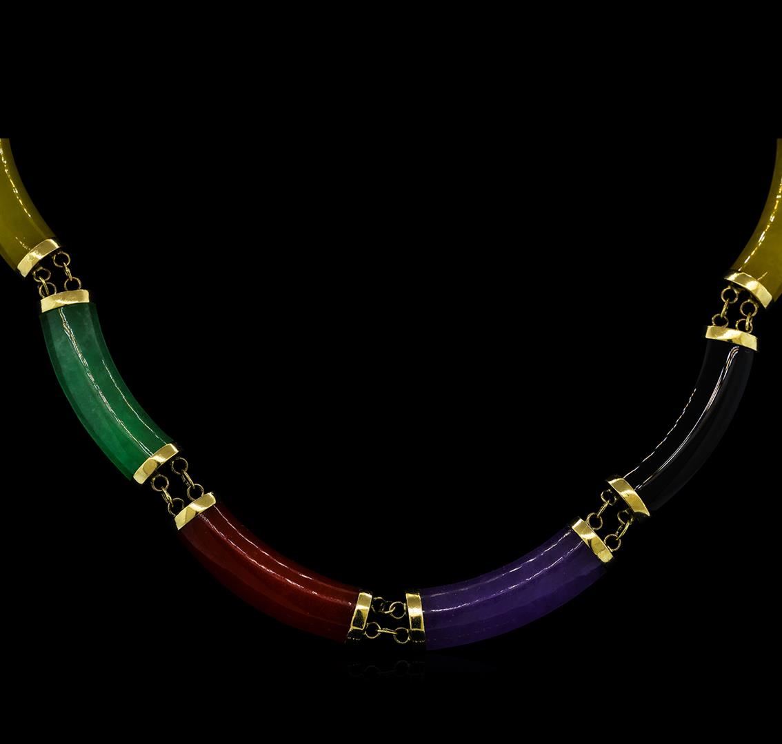 One electronically tested 14KT yellow gold ladies cast & assembled multicolor jadeite and onyx necklace. Eighteen inch length necklace features multicolor jadeite and onyx links, terminating in a stylized box clasp with safety. Bright polish finish. Identified with markings of "14K". Condition is good. Containing: Thirteen tension set curved rectangle shape cabochon Jadeite, measuring (21.00 x 6.80) 3.00mm, approximate total weight 34.72ct. good white with fine medium tone, white clouds, semi translucent, good proportion, good polish and good finish The group is composed of a mix of white, green, red, yellow, and lavender colored jadeites. Transmitting light somewhat diffusely, translucent. Naturally occurring internal & external characteristics are present. Jadeite is commonly impregnated to improve the color and texture. Evidence that may confirm this is typically lacking. Measurements are an average for the group. Graded in the setting. Three tension set rectangular cabochon cut natural onyxs, measuring 21.00 x 6.80 x 3.00mm, approximate total weight of 9.03ct., black, moderately strong, black color, (GIA Bl 10/4), cut is good. Transmitting light very diffusely, opaque. Naturally occurring internal & external characteristics are present. Measurements & the color grade are an average for the group. Graded in the setting. Total Weight of Colored Stones 9.03 ct. Total Weight of 34.72 ct. Total Weight of Necklace 22.70 gm. AIG Appraised at $3,105.00.