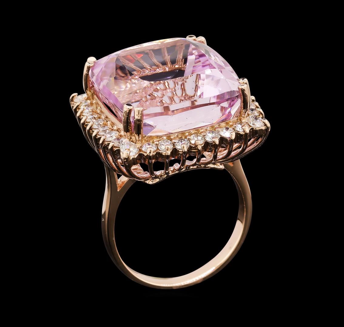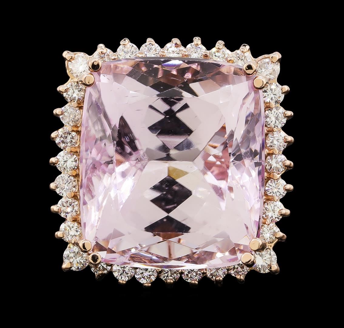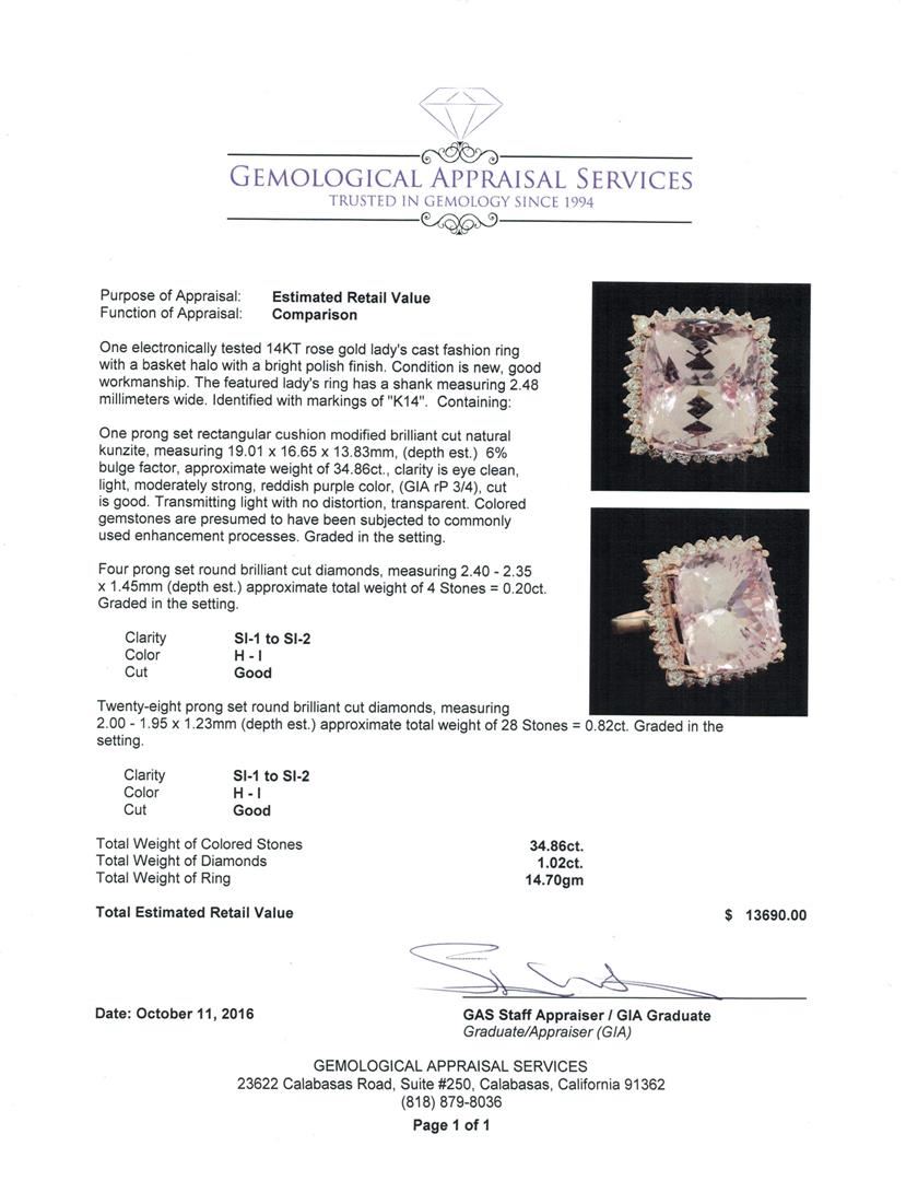 One electronically tested 14KT rose gold lady's cast fashion ring with a basket halo with a bright polish finish. The featured lady's ring has a shank measuring 2.48 millimeters wide. Identified with markings of 'K14'. Condition is new, good workmanship. Containing: One prong set rectangular cushion modified brilliant cut natural kunzite, measuring 19.01 x 16.65 x 13.83mm, (depth est.) 6%. bulge factor, approximate weight of 34.86ct., clarity is eye clean, light, moderately strong, reddish purple color, (GIA rP 3/4), cut is good. Transmitting light with no distortion, transparent. Colored gemstones are presumed to have been subjected to commonly used enhancement processes. Graded in the setting. Four prong set round brilliant cut diamonds, measuring 2.40 - 2.35 x 1.45mm (depth est.) approximate total weight of 4 Stones = 0.20ct. Graded in the setting. Clarity SI-1 to SI-2. Color: H - I Cut Good Twenty-Eight prong set round brilliant cut diamonds, measuring 2.00 - 1.95 x 1.23mm (depth est.) approximate total weight of 28 Stones = 0.82ct. Graded in the setting. Clarity SI-1 to SI-2. Color: H - I Cut Good. Total Weight of Colored Stones 34.86ct.. Total Weight of Diamonds 1.02ct.. Total Weight of Ring 14.70gm. GAS Appraised at $13,690.00.