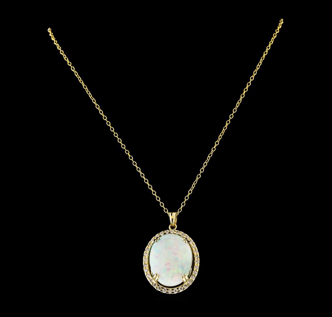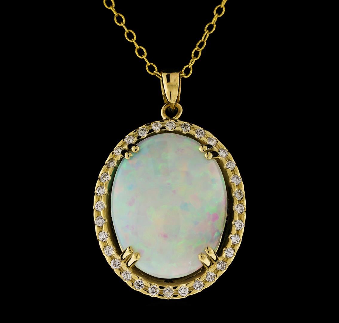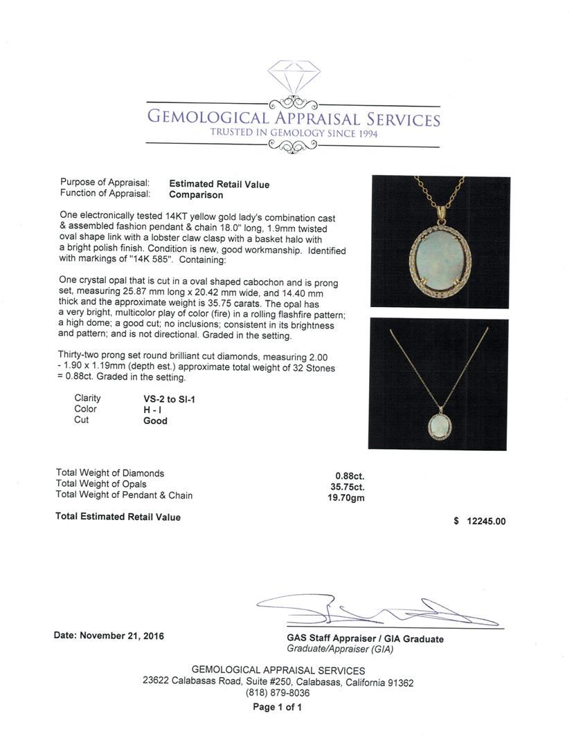 One electronically tested 14KT yellow gold lady's combination cast & assembled fashion pendant & chain 18.0' long, 1.9mm twisted oval shape link with a lobster claw clasp with a basket halo with a bright polish finish. Identified with markings of '14K 585'. Condition is new, good workmanship. Containing: One crystal opal that is cut in a oval shaped cabochon and is prong set, measuring 25.87 mm long x 20.42 mm wide, and 14.40 mm thick and the approximate weight is 35.75 carats. The opal has a very bright, multicolor play of color (fire) in a rolling flashfire pattern; a high dome; a good cut; no inclusions; consistent in its brightness and pattern; and is not directional. Graded in the setting. Thirty-Two prong set round brilliant cut diamonds, measuring 2.00 - 1.90 x 1.19mm (depth est.) approximate total weight of 32 Stones = 0.88ct. Graded in the setting. Clarity VS-2 to SI-1. Color: H - I Cut Good. Total Weight of Diamonds 0.88ct.. Total Weight of Opals 35.75ct.. Total Weight of Pendant & Chain 19.70gm. GAS Appraised at $12,245.00.