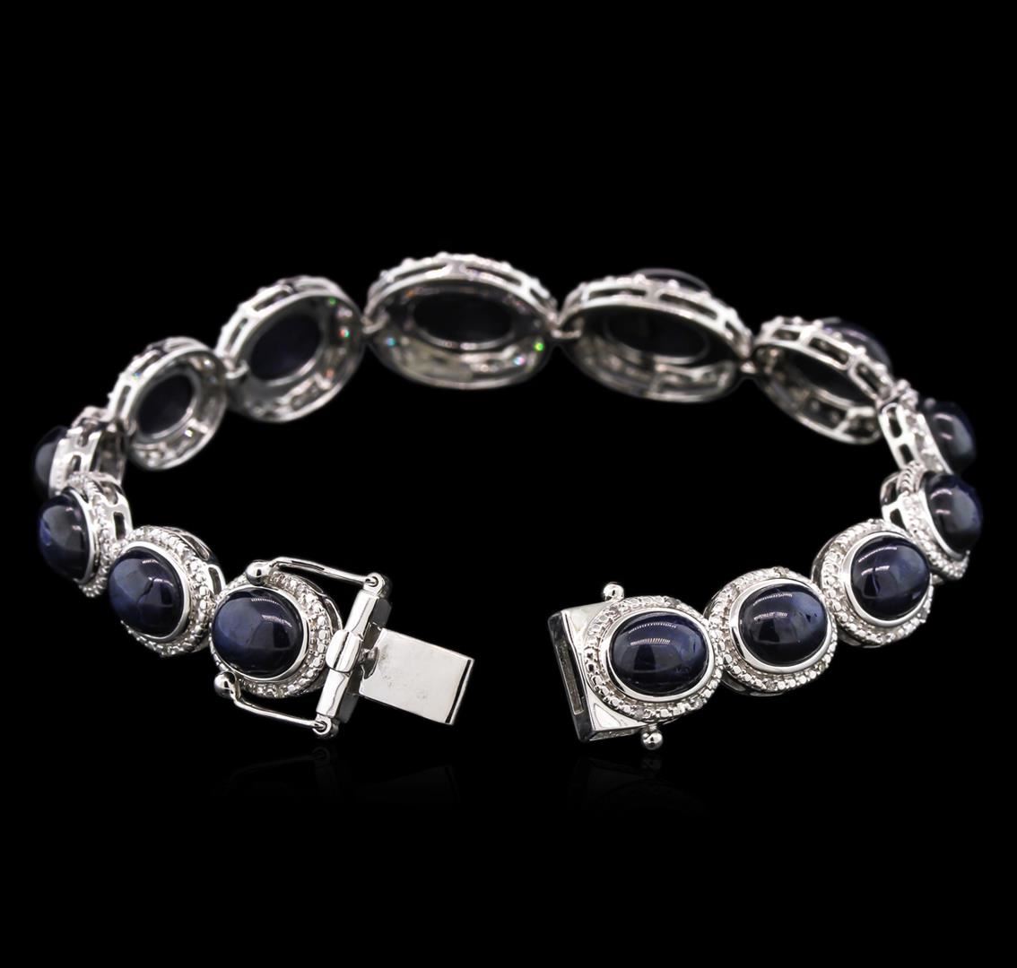 One electronically tested 14KT white gold ladies cast & assembled sapphire and diamond bracelet. Seven and one-quarter inch length bracelet features a graduating flexible star sapphire and diamond bezel ribbon, terminating in a concealed clasp with twin safeties. Bright polish finish. Trademark is Orianne. Identified with markings of "14K". Condition is new, good workmanship. Containing: Fourteen prong set oval cabochon cut natural blue star sapphires approximate total weight of 35.86ct., dark, very slightly grayish, violetish blue color, (GIA vB 7/3), cut is good. Each stone has a complete six ray star with strong intensity and good movement. Transmitting light very diffusely, opaque. Naturally occurring internal & external characteristics are present. Color grade is an average for the group. Indications of laboratory high temperature diffusion treatment. Graded in the setting. One Hundred Thirty-Six prong set round brilliant and single cut diamonds approximate total weight of 136 Stones = 3.65ct. Graded in the setting. Clarity: I-1 to I-2. Color: G - I. Total Weight of Colored Stones 35.86ct. Total Weight of Diamonds 3.65ct. Total Weight of Bracelet 26.36gm. AIG Appraised at $20,245.00.