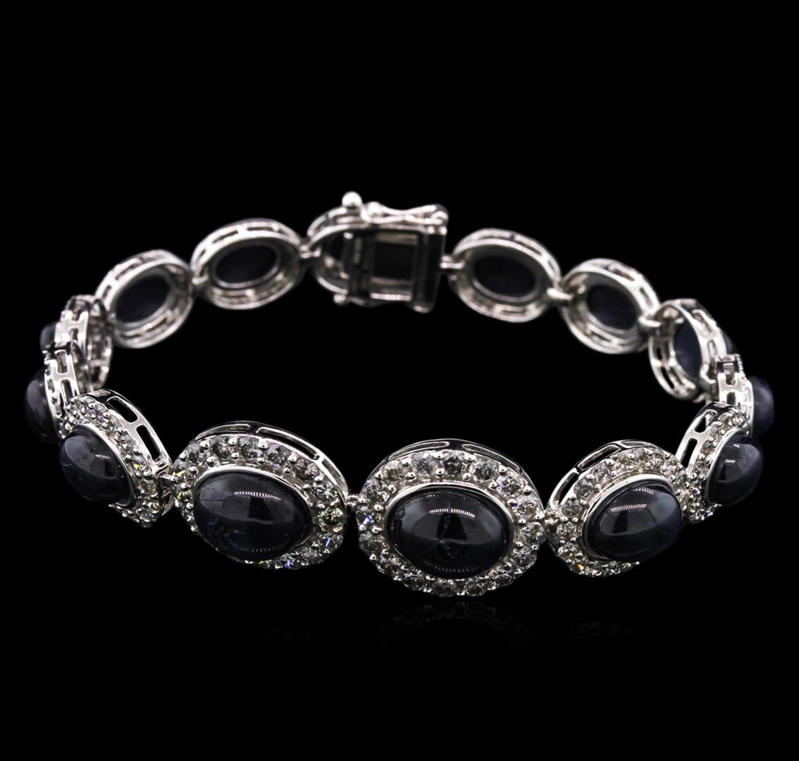 One electronically tested 14KT white gold ladies cast & assembled sapphire and diamond bracelet. Seven and one-quarter inch length bracelet features a graduating flexible star sapphire and diamond bezel ribbon, terminating in a concealed clasp with twin safeties. Bright polish finish. Trademark is Orianne. Identified with markings of "14K". Condition is new, good workmanship. Containing: Fourteen prong set oval cabochon cut natural blue star sapphires approximate total weight of 35.86ct., dark, very slightly grayish, violetish blue color, (GIA vB 7/3), cut is good. Each stone has a complete six ray star with strong intensity and good movement. Transmitting light very diffusely, opaque. Naturally occurring internal & external characteristics are present. Color grade is an average for the group. Indications of laboratory high temperature diffusion treatment. Graded in the setting. One Hundred Thirty-Six prong set round brilliant and single cut diamonds approximate total weight of 136 Stones = 3.65ct. Graded in the setting. Clarity: I-1 to I-2. Color: G - I. Total Weight of Colored Stones 35.86ct. Total Weight of Diamonds 3.65ct. Total Weight of Bracelet 26.36gm. AIG Appraised at $20,245.00.