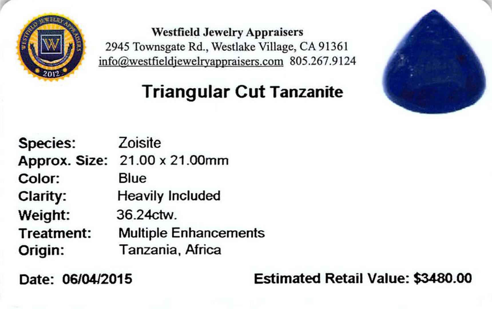 One triangle cabochon cut natural tanzanite, measuring 21.00 x 21.00 x 11.00mm, exact weight 36.24ct., clarity is heavily included, type I, dark, very slightly grayish, blue color, (GIA B 7/3), cut is good. Transmitting light somewhat diffusely, transparent to translucent. Naturally occurring internal & external characteristics are present. Indications of heat treatment. Westfield Appraised at $3,480.00.