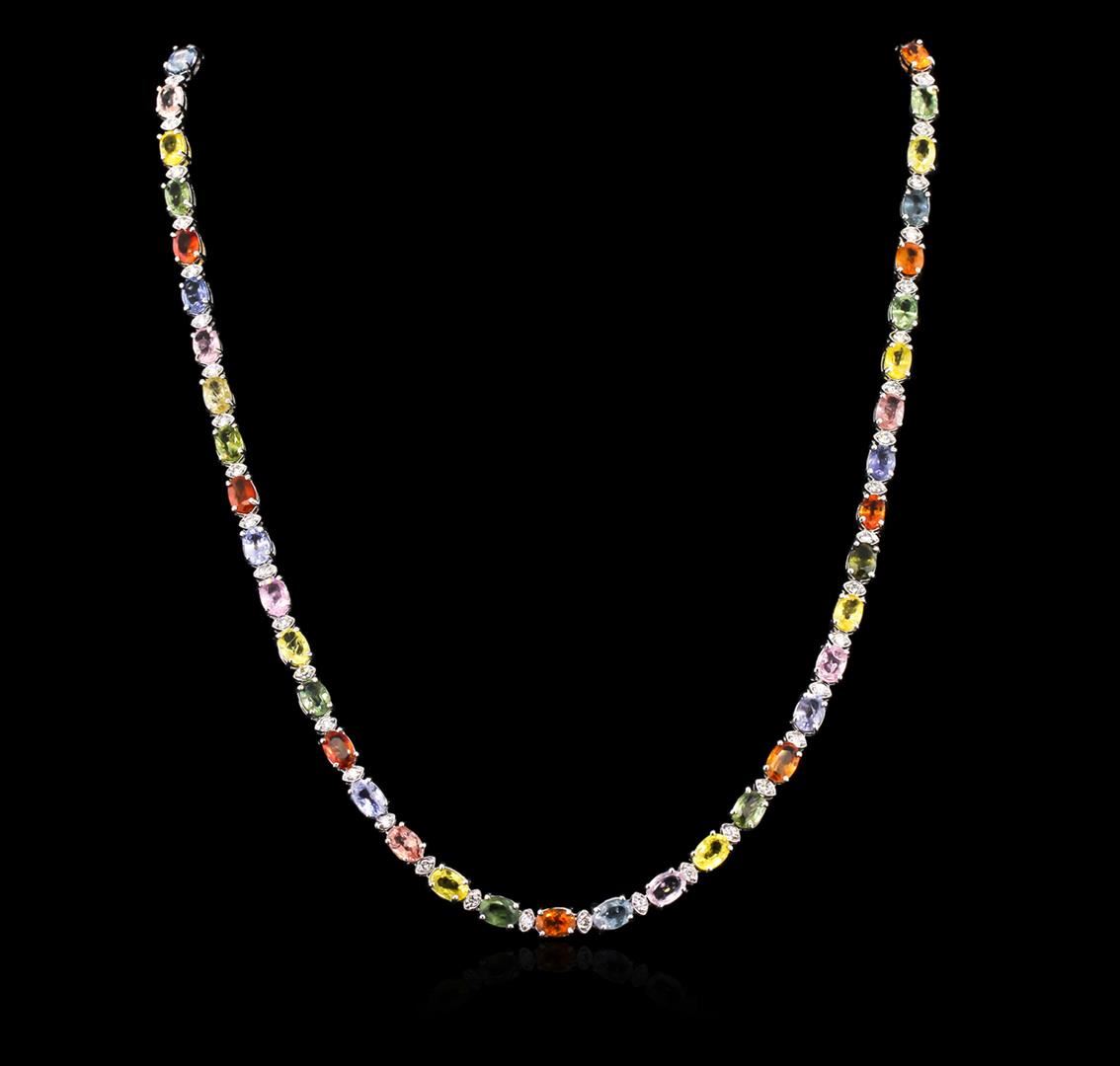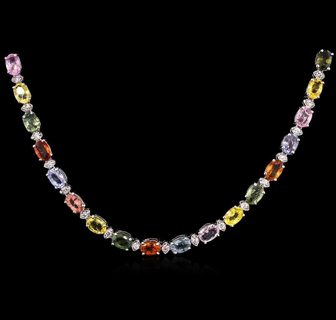 One electronically tested 14KT white gold lady's combination cast & assembled straight line tennis necklace with a tongue clasp with foldover safety with a bright polish finish. The featured lady's necklace measures 18.25 inches in length. Identified with markings of "K14". Condition is new, good workmanship. Containing: Fifty-three prong set oval modified mixed cut natural multi-color sapphires, measuring 6.10 x 4.10 x 2.85mm, 15% bulge factor, approximate total weight of 36.50ct., clarity is moderately included, cut is good. The multi-color sapphires vary in hue from blue to green to yellow to pink to orangy red to red. Colored gemstones are presumed to have been subjected to commonly used enhancement processes. Graded in the setting. Fifty-Three prong set round brilliant cut diamonds, measuring 2.00 - 1.95 x 1.27mm (depth est.) approximate total weight of 53 Stones = 1.61ct. Graded in the setting. Clarity: SI-1 to I-1. Color: H - I. Cut Good. Total Weight of Colored Stones 36.50ct. Total Weight of Diamonds 1.61ct. Total Weight of Necklace 24.50gm at $14600.00.. GAS Appraised at $14,600.00.
