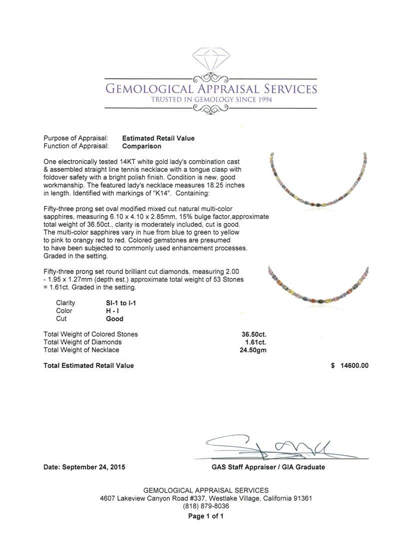 One electronically tested 14KT white gold lady's combination cast & assembled straight line tennis necklace with a tongue clasp with foldover safety with a bright polish finish. The featured lady's necklace measures 18.25 inches in length. Identified with markings of "K14". Condition is new, good workmanship. Containing: Fifty-three prong set oval modified mixed cut natural multi-color sapphires, measuring 6.10 x 4.10 x 2.85mm, 15% bulge factor, approximate total weight of 36.50ct., clarity is moderately included, cut is good. The multi-color sapphires vary in hue from blue to green to yellow to pink to orangy red to red. Colored gemstones are presumed to have been subjected to commonly used enhancement processes. Graded in the setting. Fifty-Three prong set round brilliant cut diamonds, measuring 2.00 - 1.95 x 1.27mm (depth est.) approximate total weight of 53 Stones = 1.61ct. Graded in the setting. Clarity: SI-1 to I-1. Color: H - I. Cut Good. Total Weight of Colored Stones 36.50ct. Total Weight of Diamonds 1.61ct. Total Weight of Necklace 24.50gm at $14600.00.. GAS Appraised at $14,600.00.