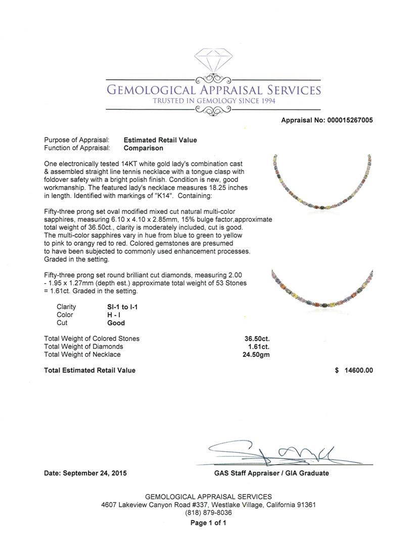 One electronically tested 14KT white gold lady's combination cast & assembled straight line tennis necklace with a tongue clasp with foldover safety with a bright polish finish. The featured lady's necklace measures 18.25 inches in length. Identified with markings of "K14". Condition is new, good workmanship. Containing: Fifty-three prong set oval modified mixed cut natural multi-color sapphires, measuring 6.10 x 4.10 x 2.85mm, 15% bulge factor, approximate total weight of 36.50ct., clarity is moderately included, cut is good. The multi-color sapphires vary in hue from blue to green to yellow to pink to orangy red to red. Colored gemstones are presumed to have been subjected to commonly used enhancement processes. Graded in the setting. Fifty-Three prong set round brilliant cut diamonds, measuring 2.00 - 1.95 x 1.27mm (depth est.) approximate total weight of 53 Stones = 1.61ct. Graded in the setting. Clarity: SI-1 to I-1. Color: H - I. Cut Good. Total Weight of Colored Stones 36.50ct. Total Weight of Diamonds 1.61ct. Total Weight of Necklace 24.50gm at $14600.00.. GAS Appraised at $14,600.00.