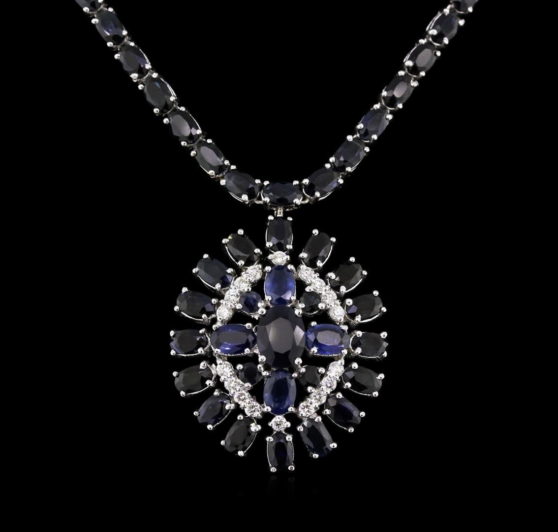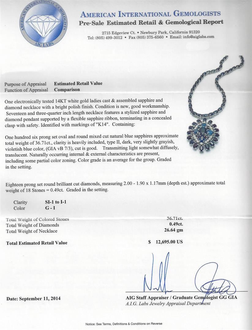 One electronically tested 14KT white gold ladies cast & assembled sapphire and diamond necklace with a bright polish finish. Seventeen and three-quarter inch length necklace features a stylized sapphire and diamond pendant supported by a flexible sapphire ribbon, terminating in a concealed clasp with safety. Identified with markings of "K14". Condition is new, good workmanship. Containing: One hundred six prong set oval and round mixed cut natural blue sapphires approximate total weight of 36.71ct., clarity is heavily included, type II, dark, very slightly grayish, violetish blue color, (GIA vB 7/3), cut is good. Transmitting light somewhat diffusely, translucent. Naturally occurring internal & external characteristics are present, including some partial color zoning. Color grade is an average for the group. Graded in the setting. Eighteen prong set round brilliant cut diamonds, measuring 2.00 - 1.90 x 1.17mm (depth est.) approximate total weight of 18 Stones = 0.49ct. Graded in the setting. Clarity: SI-1 to I-1. Color: G - I. Total Weight of Colored Stones 36.71ct. Total Weight of Diamonds 0.49ct. AIG Appraised at $12,695.00.