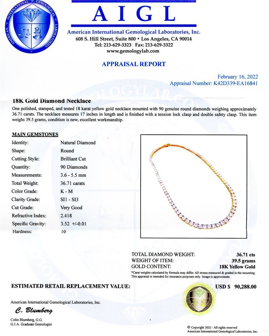 36.71ctw Diamond 18K Yellow Gold Necklace. Please see Photos and Description for all available information. This is a 36.71ctw diamond 18k yellow gold necklace. The diamond necklace weighs 17 inches in length and is crafted in 18k yellow gold. The diamonds are all round diamonds with clarity grade SI1-SI3. This diamond necklace is sure to impress anyone who receives it, as well as be a great gift for a loved one.