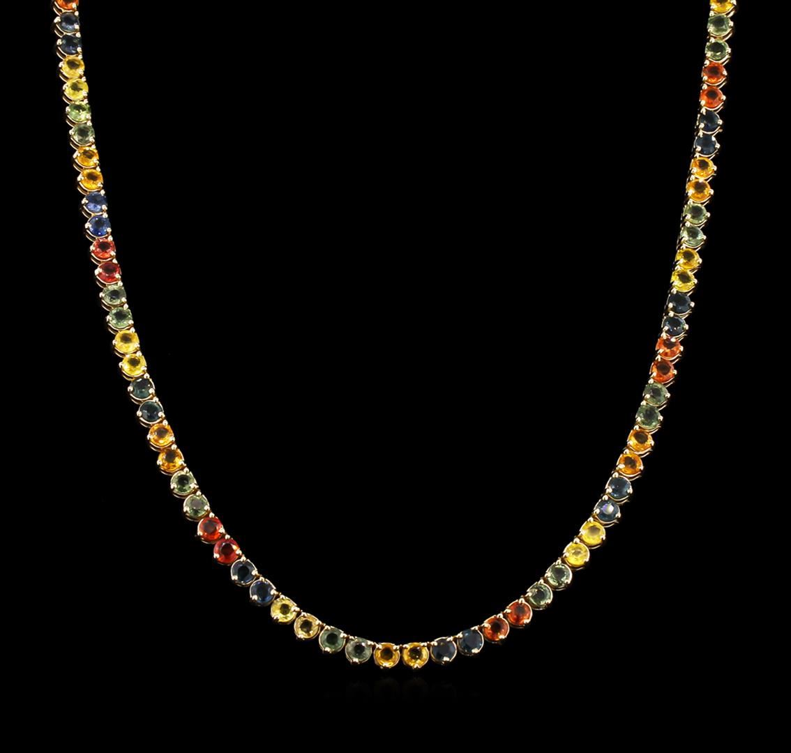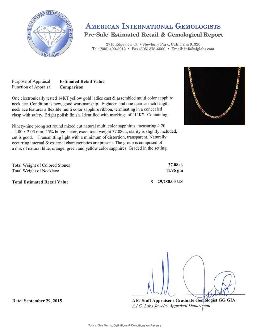 One electronically tested 14KT yellow gold ladies cast & assembled multi color sapphire bracelet. Eighteen and one-quarter inch length necklace features a flexible multi color sapphire ribbon, terminating in a concealed clasp with safety. Bright polish finish. Identified with markings of "14K". Condition is new, good workmanship. Containing: Ninety-nine prong set round mixed cut natural multi color sapphires, measuring 4.20 - 4.00 x 2.05 mm, 25% bulge factor, exact total weight 37.08ct., clarity is slightly included, cut is good. Transmitting light with a minimum of distortion, transparent. Naturally occurring internal & external characteristics are present. The group is composed of a mix of natural blue, orange, green and yellow color sapphires. Graded in the setting. Total Weight of Colored Stones 37.08ct. Total Weight of Bracelet 41.96gm. AIG Appraised at $29,780.00.