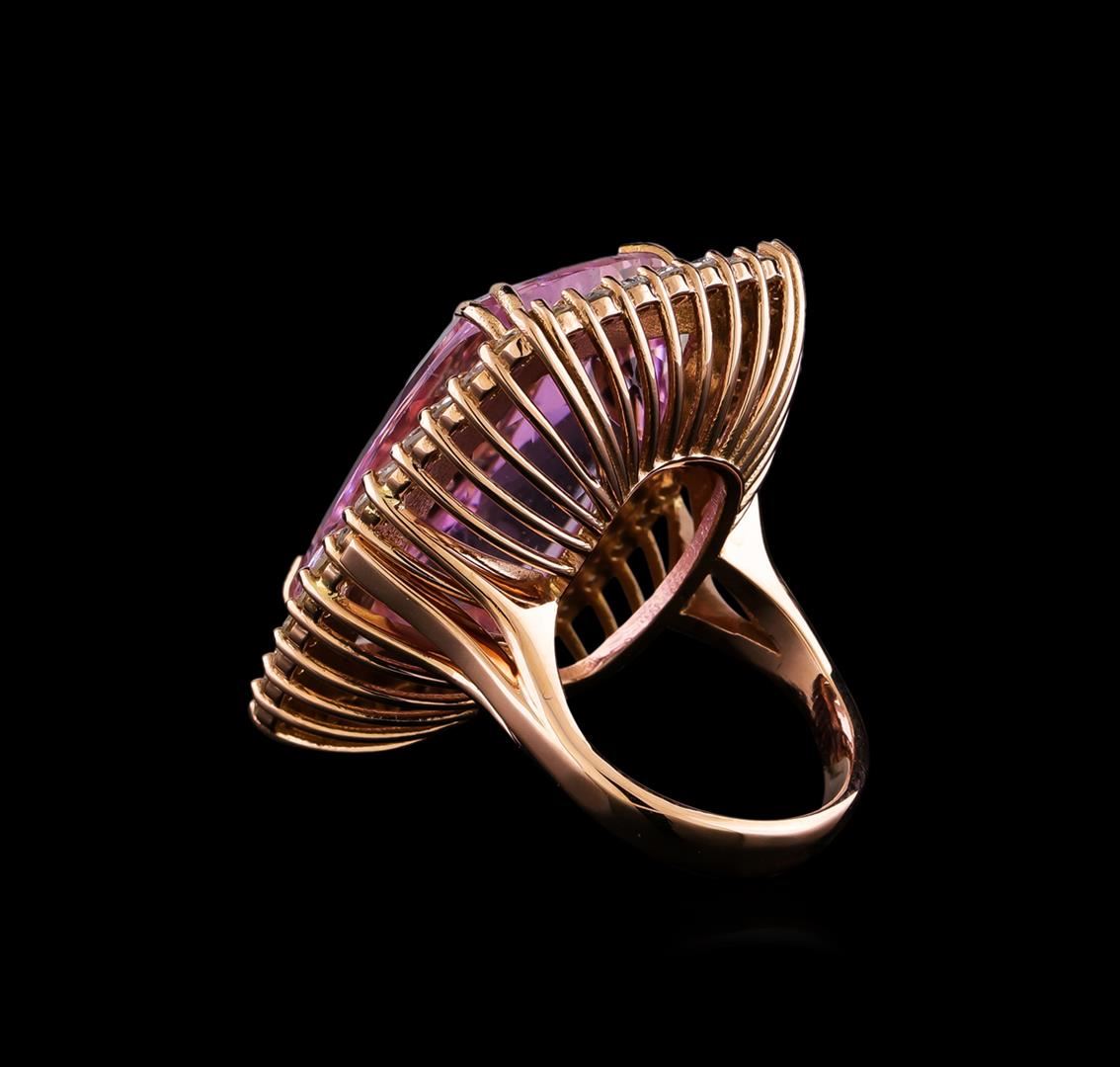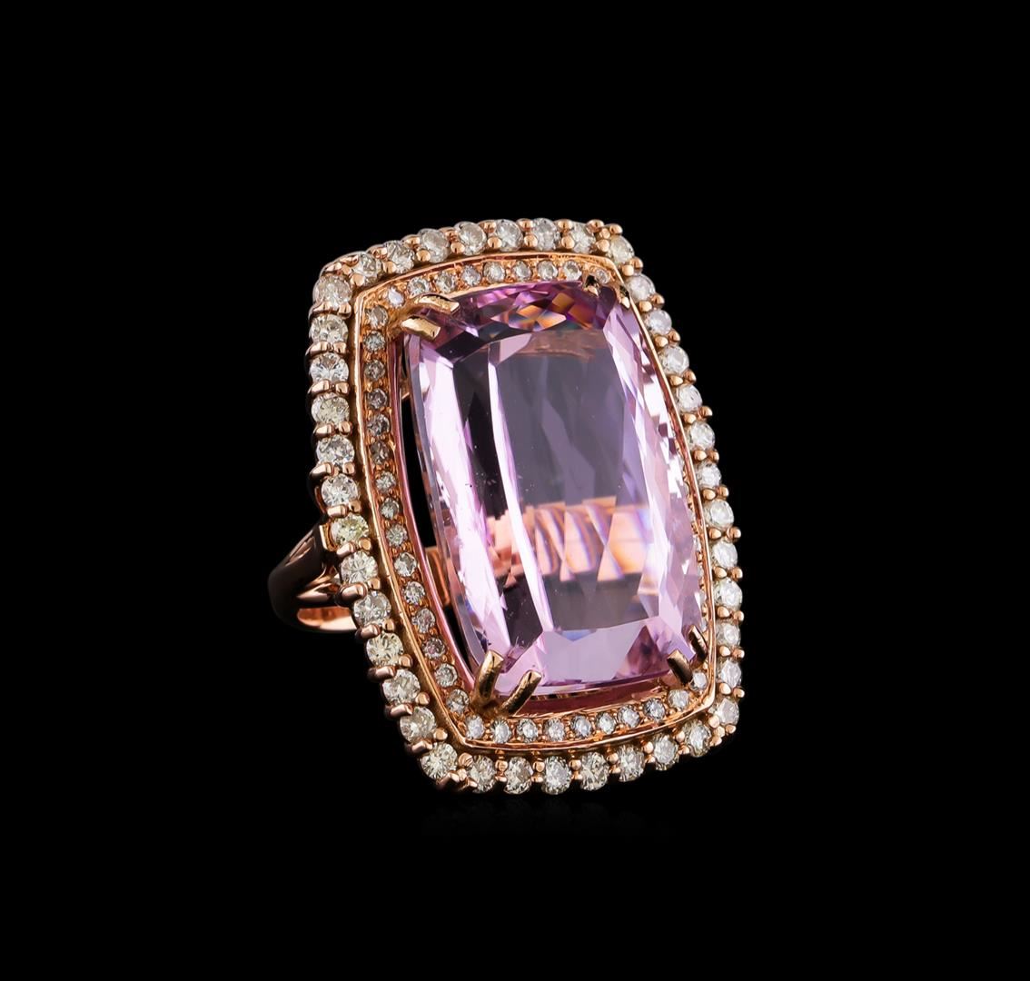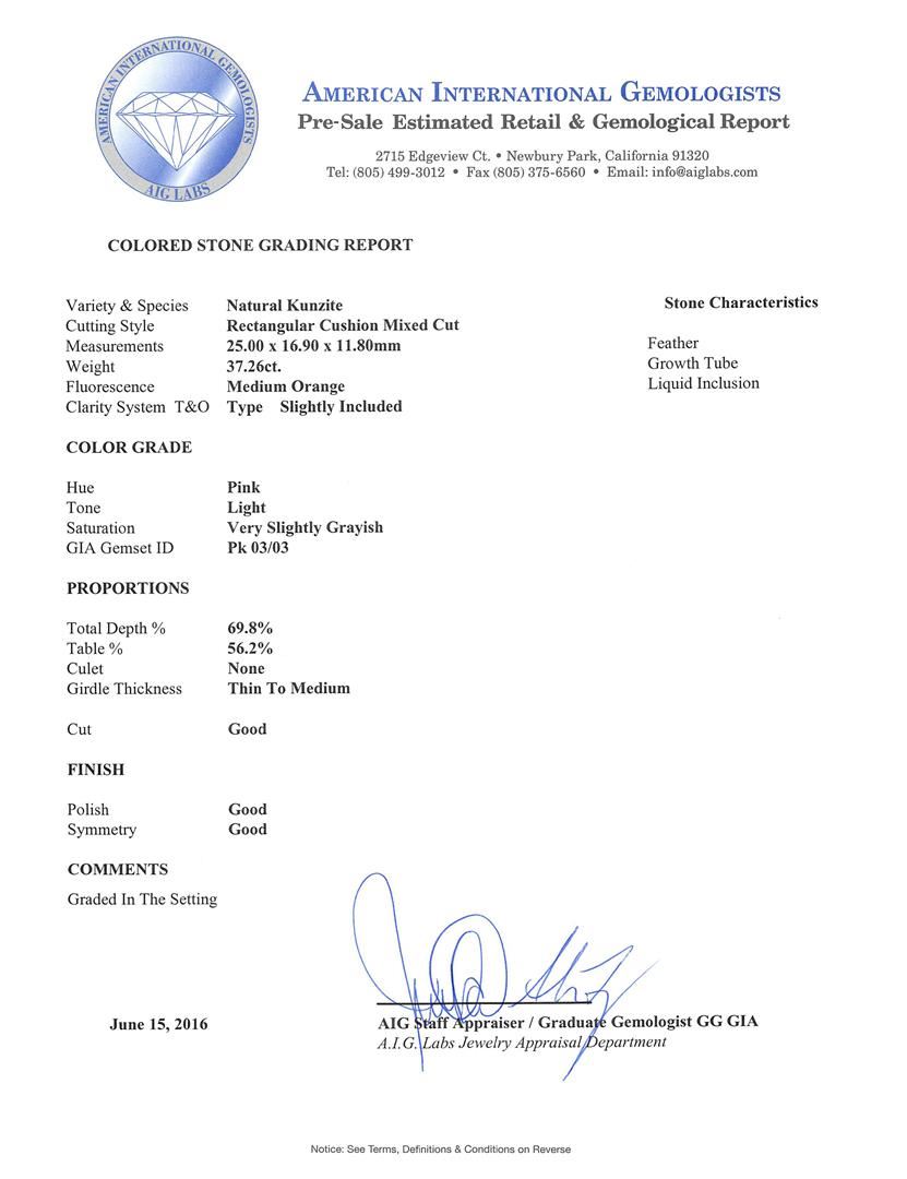 One electronically tested 14KT rose gold ladies cast kunzite and diamond ring with a bright polish finish. The featured kunzite is set within a diamond bezel frame supported by a ribbed under gallery, completed by a four millimeter wide band. Identified with markings of "14K". Condition is new, good workmanship. Containing: One prong set rectangular cushion mixed cut natural kunzite, measuring 25.00 x 16.90 x 11.80mm, approximate weight of 37.26ct., clarity is slightly included, light, very slightly grayish, pink color, (GIA Pk 3/3), cut is good. Transmitting light with a minimum of distortion, transparent. Naturally occurring internal & external characteristics are present. Colored Stone Grading Report attached. Graded in the setting. Forty prong set round brilliant cut diamonds, measuring 2.30 - 2.20 x 1.35mm (depth est.) approximate total weight of 40 Stones = 1.76ct. Color & clarity grade are an average for the group. Graded in the setting. Clarity: SI-2 to I-2. Color: G - I Forty-Eight prong set round brilliant cut diamonds, measuring 1.50 - 1.50 x 0.90mm (depth est.) approximate total weight of 48 Stones = 0.64ct. Color & clarity grade are an average for the group. Graded in the setting. Clarity: SI-1 to I-1. Color: F - H. Total Weight of Colored Stones 37.26ct. Total Weight of Diamonds 2.40ct. Total Weight of Ring 26.27gm. AIG Appraised at $19,500.00.
