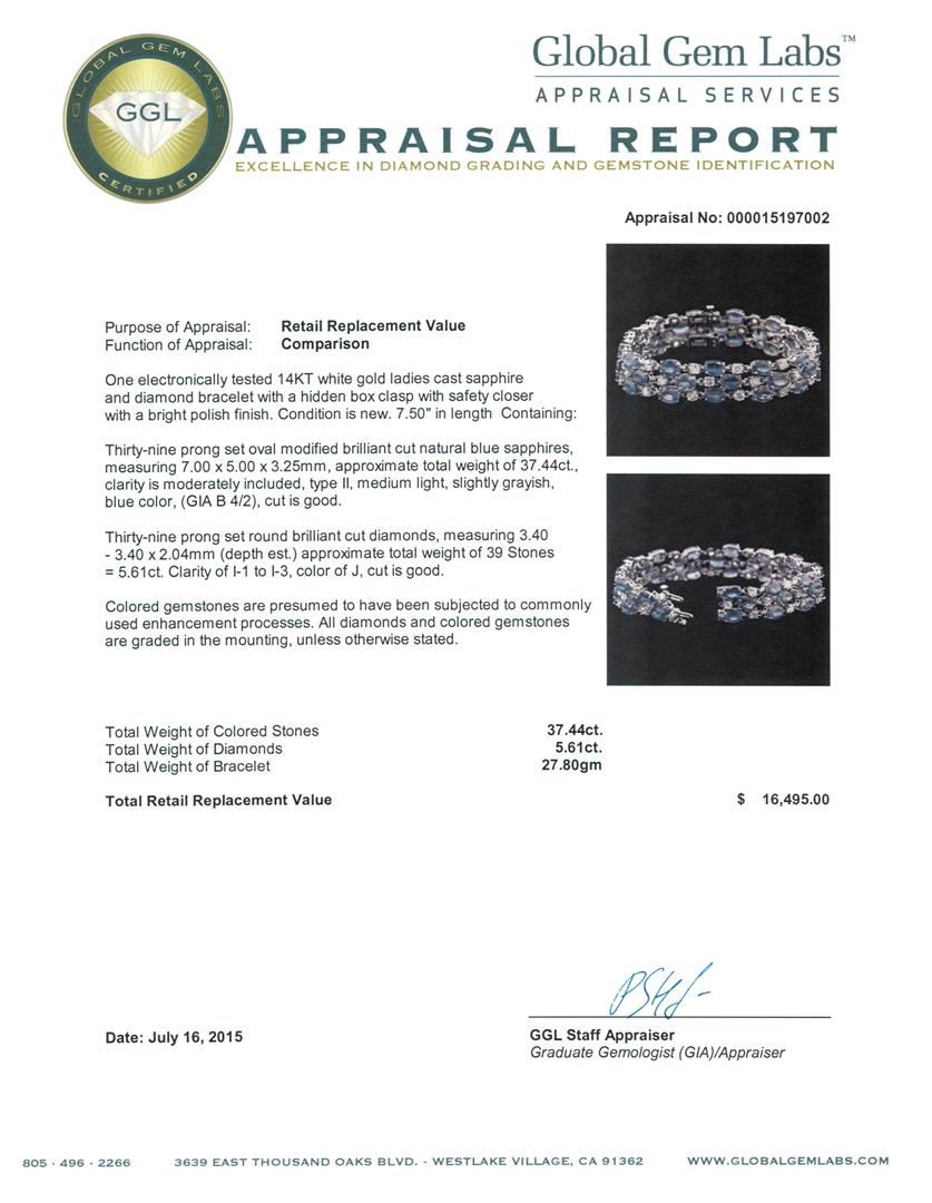 One electronically tested 14KT white gold ladies cast sapphire and diamond bracelet with a hidden box clasp with safety closer with a bright polish finish. 7.50" in length Condition is new. Containing: Thirty-nine prong set oval modified brilliant cut natural blue sapphires, measuring 7.00 x 5.00 x 3.25mm, approximate total weight of 37.44ct., clarity is moderately included, type II, medium light, slightly grayish, blue color, (GIA B 4/2), cut is good. Thirty-Nine prong set round brilliant cut diamonds, measuring 3.40 - 3.40 x 2.04mm (depth est.) approximate total weight of 39 Stones = 5.61ct. Clarity: I-1 to I-3. Color: J, Cut is Good. Colored gemstones are presumed to have been subjected to commonly used enhancement processes. All diamonds and colored gemstones are graded in the mounting, unless otherwise stated. Total Weight of Colored Stones 37.44ct. Total Weight of Diamonds 5.61ct. Total Weight of Bracelet 27.80 grams. GGL Appraised at $16,495.00.