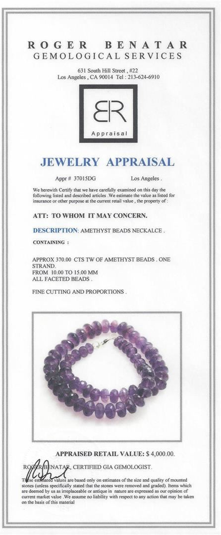 One necklace featuring amethyst beads with a total approximate weight of 370.00ct measuring 10.00 - 15.00mm. All faceted beads. Fine cutting/proportions. RBGS Appraised at $4,000.00.