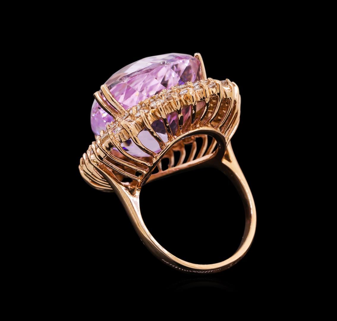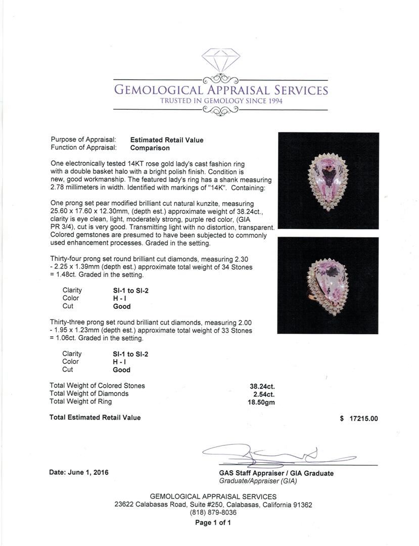 One electronically tested 14KT rose gold lady's cast fashion ring with a double basket halo with a bright polish finish. The featured lady's ring has a shank measuring 2.78 millimeters in width. Identified with markings of "14K". Condition is new, good workmanship. Containing: One prong set pear modified brilliant cut natural kunzite, measuring 25.60 x 17.60 x 12.30mm, (depth est.) approximate weight of 38.24ct., clarity is eye clean, light, moderately strong, purple red color, (GIA PR 3/4), cut is very good. Transmitting light with no distortion, transparent. Colored gemstones are presumed to have been subjected to commonly used enhancement processes. Graded in the setting. Thirty-Four prong set round brilliant cut diamonds, measuring 2.30 - 2.25 x 1.39mm (depth est.) approximate total weight of 34 Stones = 1.48ct. Graded in the setting. Clarity: SI-1 to SI-2. Color: H - I. Cut Good Thirty-Three prong set round brilliant cut diamonds, measuring 2.00 - 1.95 x 1.23mm (depth est.) approximate total weight of 33 Stones = 1.06ct. Graded in the setting. Clarity: SI-1 to SI-2. Color: H - I. Cut Good. Total Weight of Colored Stones 38.24ct. Total Weight of Diamonds 2.54ct. Total Weight of Ring 18.50gm. GAS Appraised at $17,215.00.