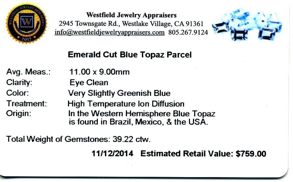 39.22ctw. Emerald Cut Blue Topaz Parcel. Westfield Appraised at $759.00.