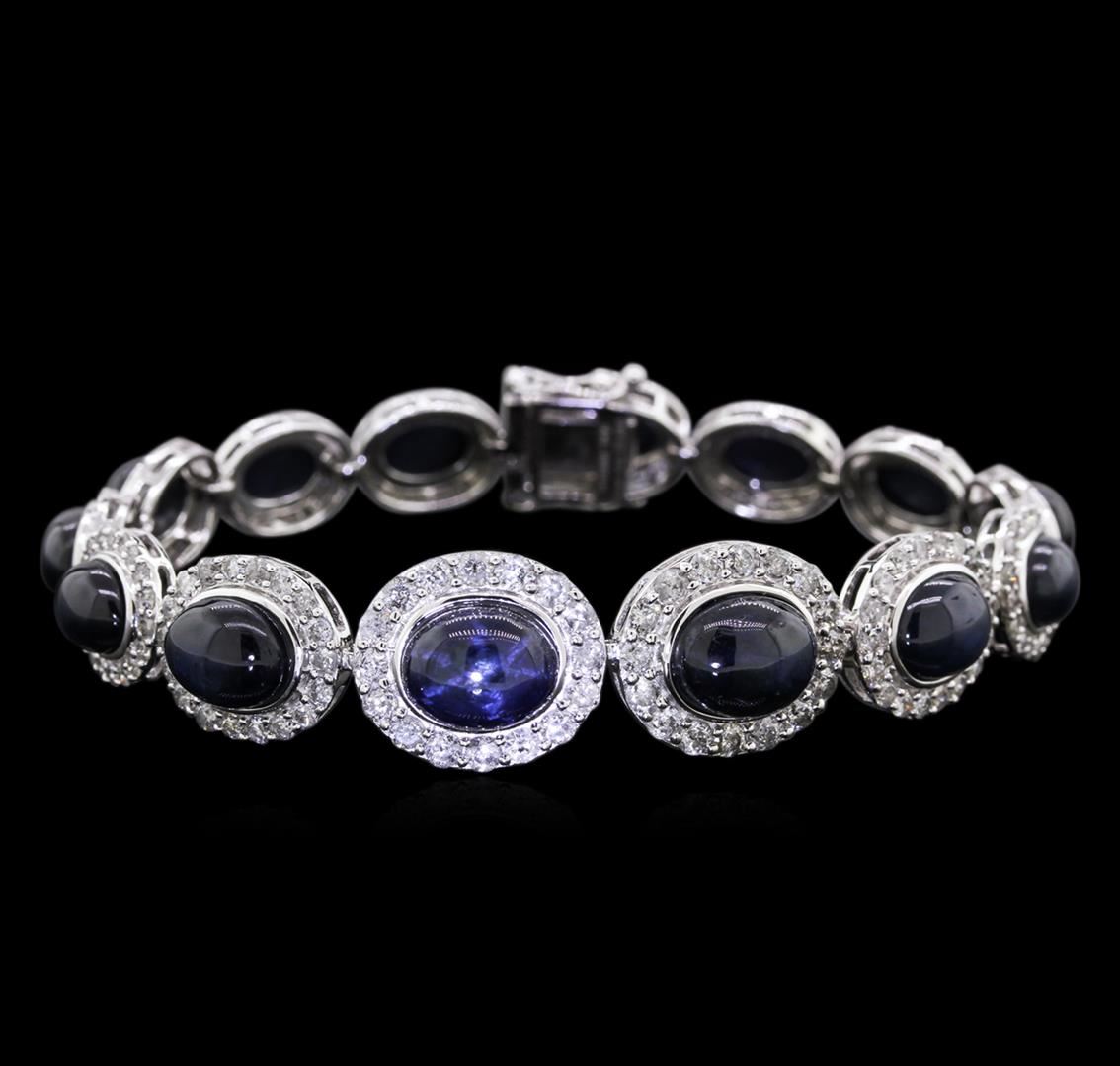 One electronically tested 14KT white gold ladies cast & assembled star sapphire and diamond bracelet. Seven and one-quarter inch length bracelet features a graduating flexible star sapphire and diamond bezel ribbon, terminating in a concealed clasp with twin safeties. Bright polish finish. Trademark is Orianne. Identified with markings of "14K". Condition is new, good workmanship. Containing: Fourteen prong set oval cabochon cut natural blue star sapphires approximate total weight of 39.31ct., dark, very slightly grayish, violetish blue color, (GIA vB 7/3), cut is good. Each stone has a complete six ray star with strong intensity and good movement. Transmitting light very diffusely, opaque. Naturally occurring internal & external characteristics are present. Color grade is an average for the group. Indications of laboratory high temperature diffusion treatment. Graded in the setting. One Hundred Thirty-Six prong set round brilliant and single cut diamonds approximate total weight of 136 Stones = 3.68ct. Graded in the setting. Clarity: I-1 to I-2. Color: G - I. Total Weight of Colored Stones 39.31ct. Total Weight of Diamonds 3.68ct. Total Weight of Bracelet 27.13gm. AIG Appraised at $21,250.00.