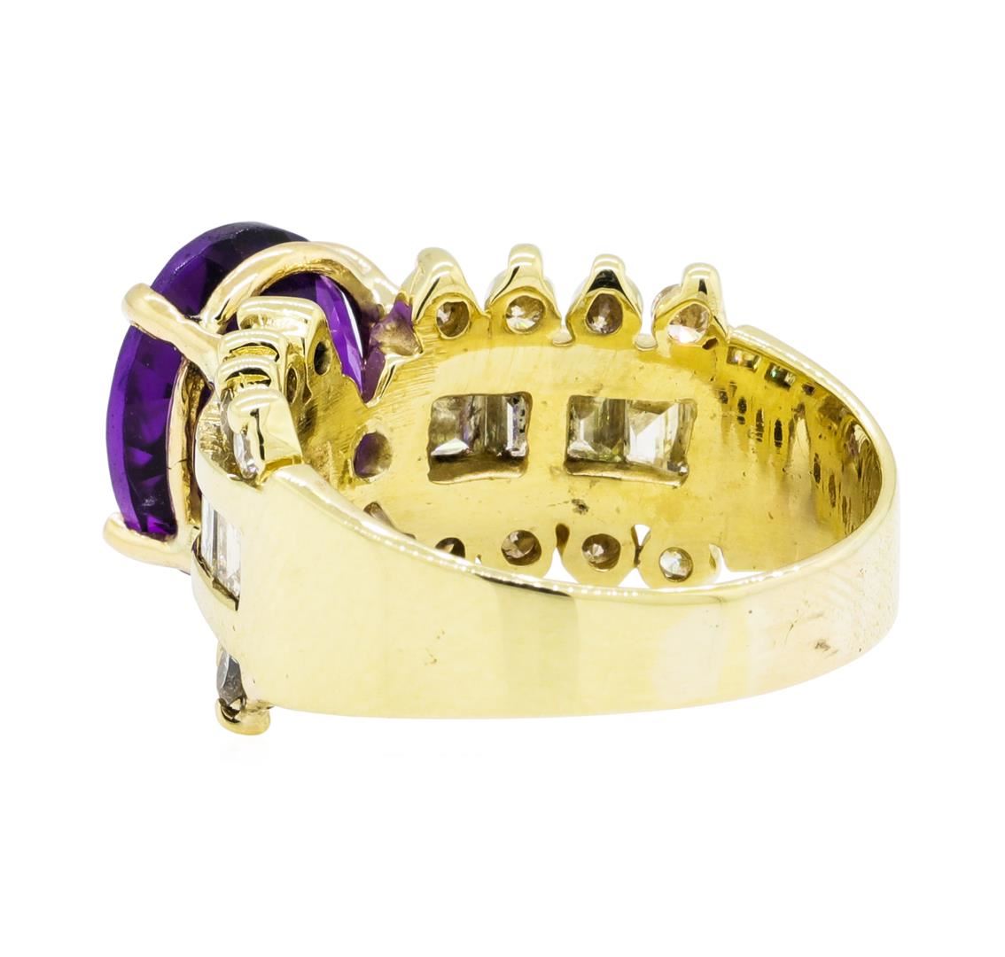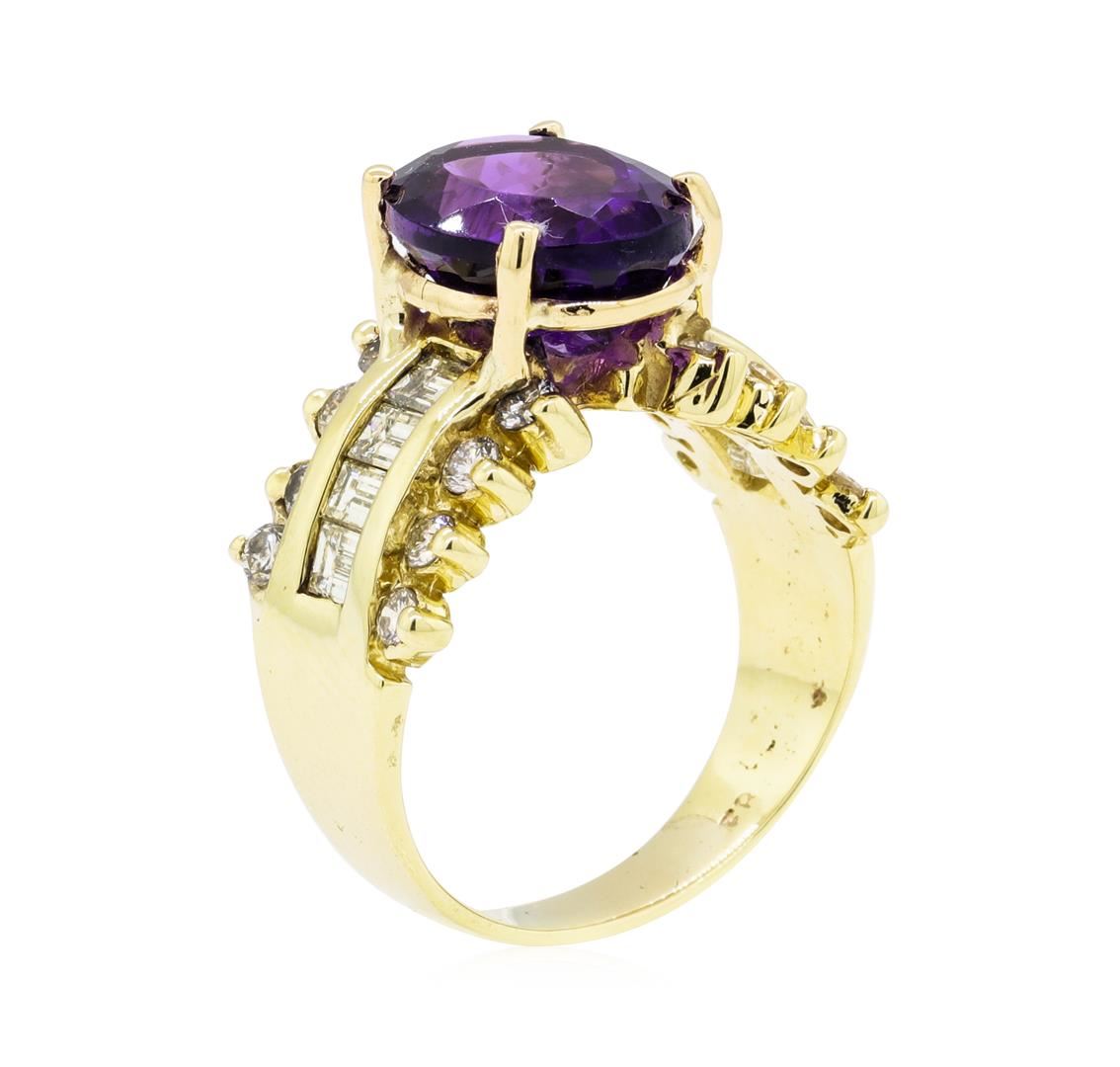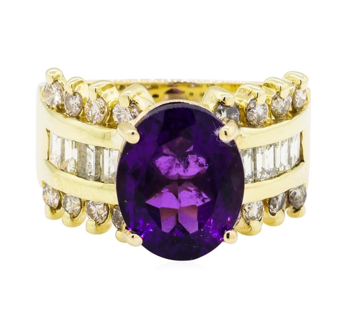 One lady's ring featuring: 14KT yellow gold weighing 7.5 grams containing one amethyst weighing 4.00ct and diamonds weighing 1.00ctw.