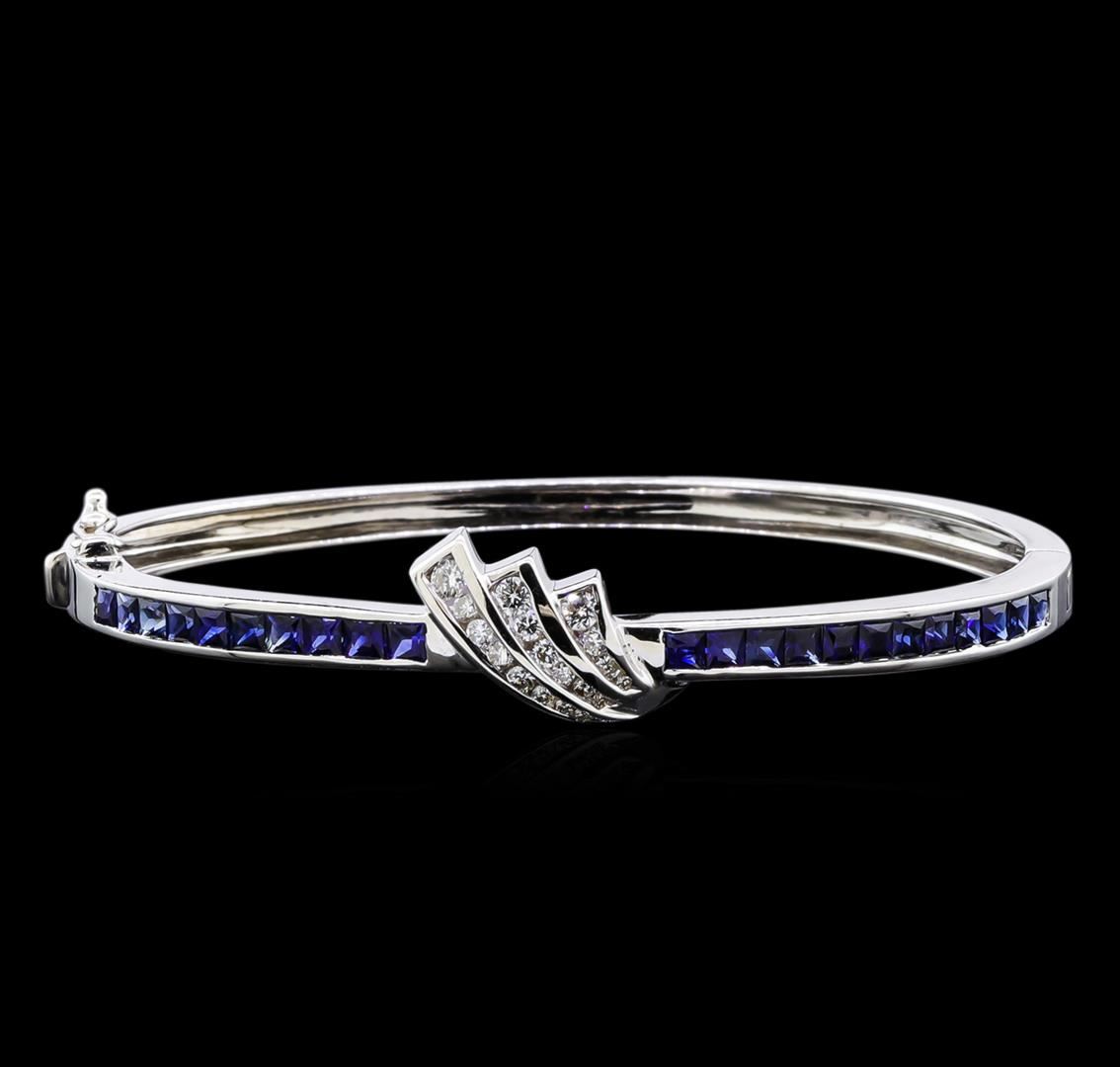 One 18KT white gold 4.00ctw sapphire and diamond bracelet. Metal: 18KT solid white gold. Face Measurements: 12 x 63mm. Size: 7.5. Finish: Bright polish. Total Item Weight: 23.17 grams. Markings: Stamped 18KT. Containing: 22 princess cut blue Sapphires with a total weight of 4.00ct. Measuring: 3 x 2.8 x 2.1mm. Color: Blue. Setting: Channel. Saturation: Very slightly grayish. Tone: Medium dark. Clarity: Type 2. Cut: Good. The sapphires are complemented by 18 round Diamonds with a total weight of 0.80ct. Treatment: None. Setting: Channel. Color Grade: G - I. Clarity: SI1 - SI2. Cut: Very good. Excellent workmanship. Gemstones graded in the setting. BHGL Appraised at $11,500.00.
