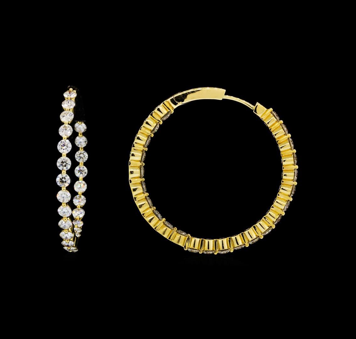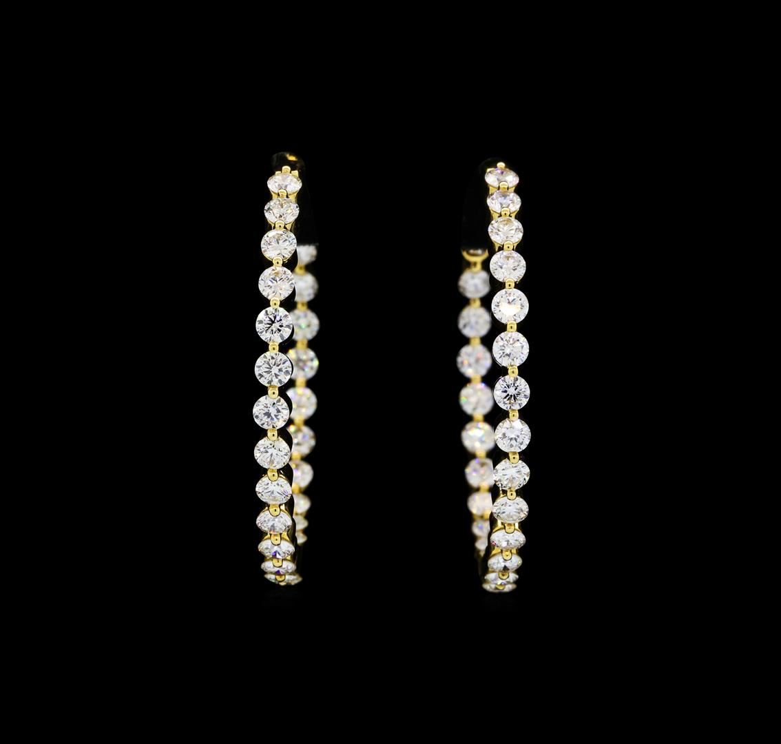 One pair electronically tested 18KT yellow gold ladies cast & assembled In and Out diamond hoop earrings with hinged, snap locking posts. Each earring features a circular diamond ribbon hoop measuring one and one-quarter inch in diameter. Bright polish finish. Identified with markings of '18K 750'. Condition is good. Containing: Forty-Eight prong set round brilliant cut diamonds, measuring 2.80 - 2.80 x 1.68mm (depth est.) approximate total weight of 48 Stones = 4.00ct. Graded in the setting. Clarity SI-1 to SI-2. Color: F - G. Total Weight of Diamonds 4.00ct.. Total Weight of Earrings 11.11gm. AIG Appraised at $16,095.00.