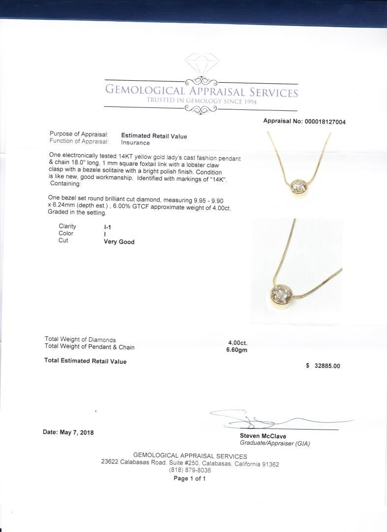 This 14KT yellow gold necklace features a bezel-set round brilliant cut diamond weighing approximately 4.00ct, graded I-1 clarity, I color, and Very Good cut. The diamond measures 9.95 x 9.90mm with an estimated depth of 6.24mm and is graded in the setting. The pendant is suspended on an 18-inch, 1mm square foxtail chain with a lobster claw clasp. With a bright polished finish and markings of "14K," the piece is in like-new condition and weighs 6.60 grams in total.