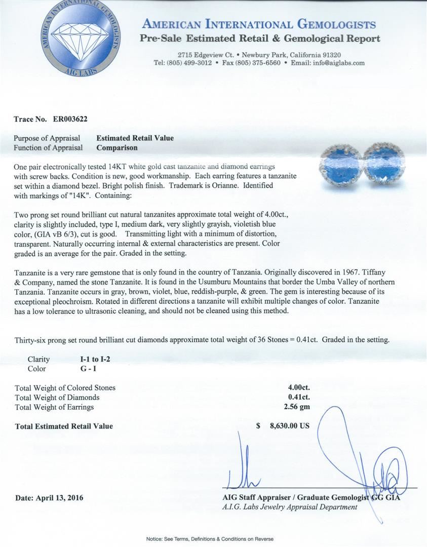 One pair electronically tested 14KT white gold cast tanzanite and diamond earrings with screw backs. Each earring features a tanzanite set within a diamond bezel. Bright polish finish. Trademark is Orianne. Identified with markings of "14K". Condition is new, good workmanship. Containing: Two prong set round brilliant cut natural tanzanites approximate total weight of 4.00ct., clarity is slightly included, type I, medium dark, very slightly grayish, violetish blue color, (GIA vB 6/3), cut is good. Transmitting light with a minimum of distortion, transparent. Naturally occurring internal & external characteristics are present. Color graded is an average for the pair. Graded in the setting. Tanzanite is a very rare gemstone that is only found in the country of Tanzania. Originally discovered in 1967. Tiffany & Company, named the stone Tanzanite. It is found in the Usumburu Mountains that border the Umba Valley of northern Tanzania. Tanzanite occurs in gray, brown, violet, blue, reddish-purple, & green. The gem is interesting because of its exceptional pleochroism. Rotated in different directions a tanzanite will exhibit multiple changes of color. Tanzanite has a low tolerance to ultrasonic cleaning, and should not be cleaned using this method. Thirty-Six prong set round brilliant cut diamonds approximate total weight of 36 Stones = 0.41ct. Graded in the setting. Clarity: I-1 to I-2. Color: G - I. Total Weight of Colored Stones 4.00ct. Total Weight of Diamonds 0.41ct. Total Weight of Earrings 2.56gm. AIG Appraised at $8,630.00.