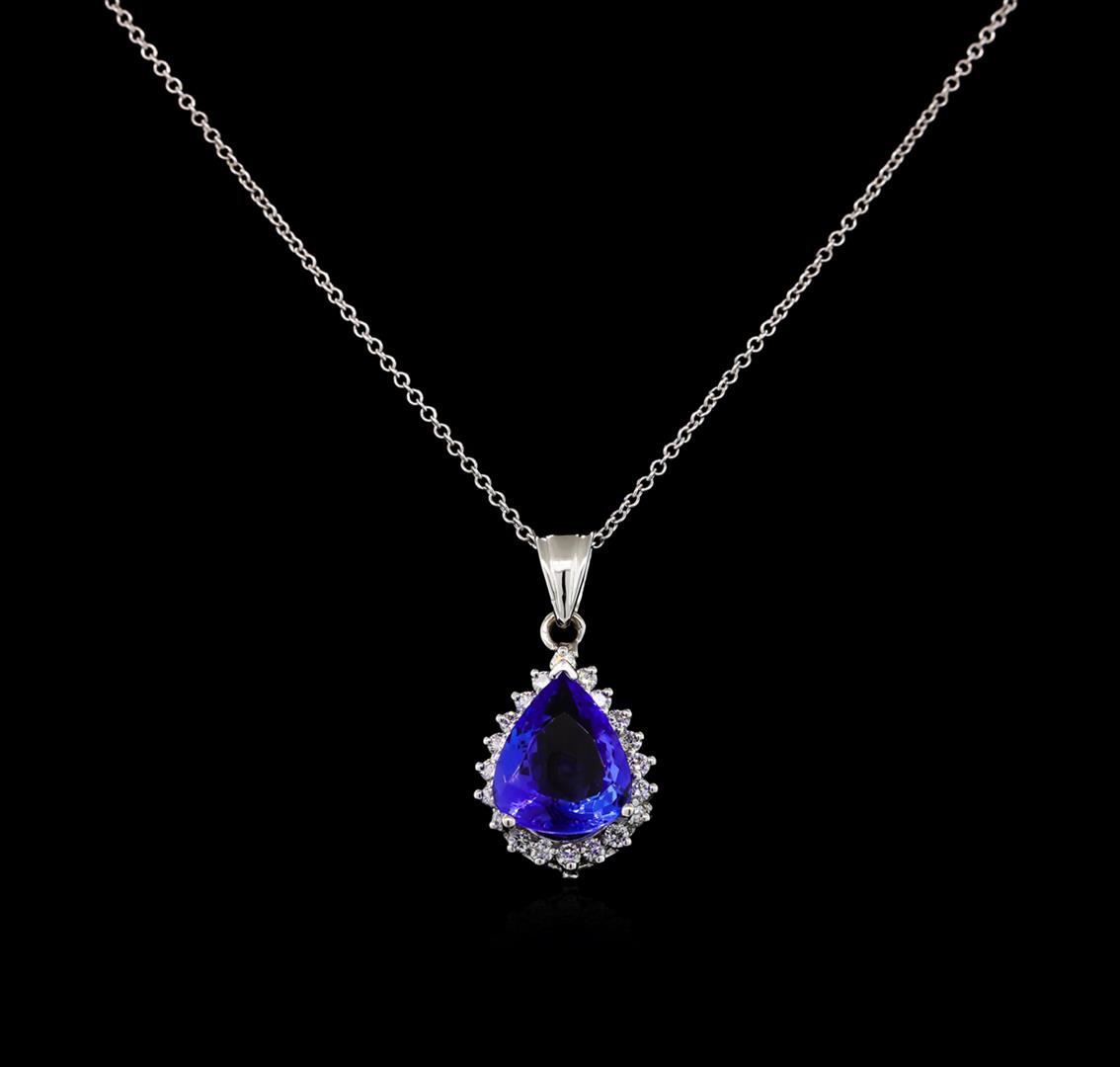One electronically tested 14KT white gold lady's combination cast & assembled fashion pendant & chain 18.0" long, 1.2mm round cable link with a lobster claw clasp with a bright polish finish. Identified with markings of "14K". Condition is new, good workmanship. Containing: One prong set pear modified brilliant cut natural tanzanite, measuring 11.80 x 10.09 x 5.41mm, approximate weight of 4.00ct., clarity is eye clean, type I, medium dark, moderately strong, violetish blue color, (GIA vB 6/4), cut is good. Transmitting light with no distortion, transparent. Colored gemstones are presumed to have been subjected to commonly used enhancement processes. Graded in the setting. Twenty prong set round brilliant cut diamonds, measuring 1.85 - 1.75 x 1.12mm (depth est.) approximate total weight of 20 Stones = 0.45ct. Graded in the setting. Clarity: SI-1 to SI-2. Color: H - I. Cut Very Good. Total Weight of Colored Stones 4.00ct. Total Weight of Diamonds 0.45ct. Total Weight of Pendant & Chain 5.50gm GAS Appraised.