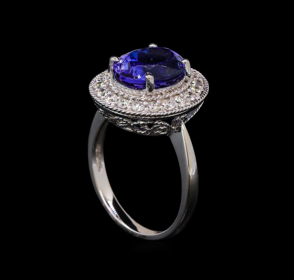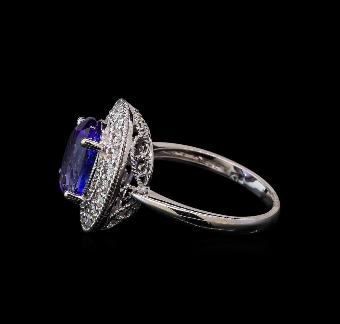 One electronically tested 14KT white gold lady's cast fashion ring with a basket halo with a bright polish with milgrain detailing finish. The featured lady's ring has a shank measuring 2.09 millimeters wide. Identified with markings of 'K14'. Condition is new, good workmanship. Containing: One prong set oval modified brilliant cut natural tanzanite, measuring 10.90 x 8.25 x 6.06mm, (depth est.) 5%. bulge factor, approximate weight of 4.00ct., clarity is eye clean, medium, very slightly grayish, bluish violet color, (GIA bV 5/3), cut is good. Transmitting light with no distortion, transparent. Colored gemstones are presumed to have been subjected to commonly used enhancement processes. Graded in the setting. Twenty prong set round brilliant cut diamonds, measuring 1.90 - 1.80 x 1.15mm (depth est.) approximate total weight of 20 Stones = 0.49ct. Graded in the setting. Clarity SI-1 to SI-2. Color: H - I Cut Good. Total Weight of Colored Stones 4.00ct. Total Weight of Diamonds 0.49ct. Total Weight of Ring 5.30gm. GAS Appraised at $7,250.00.