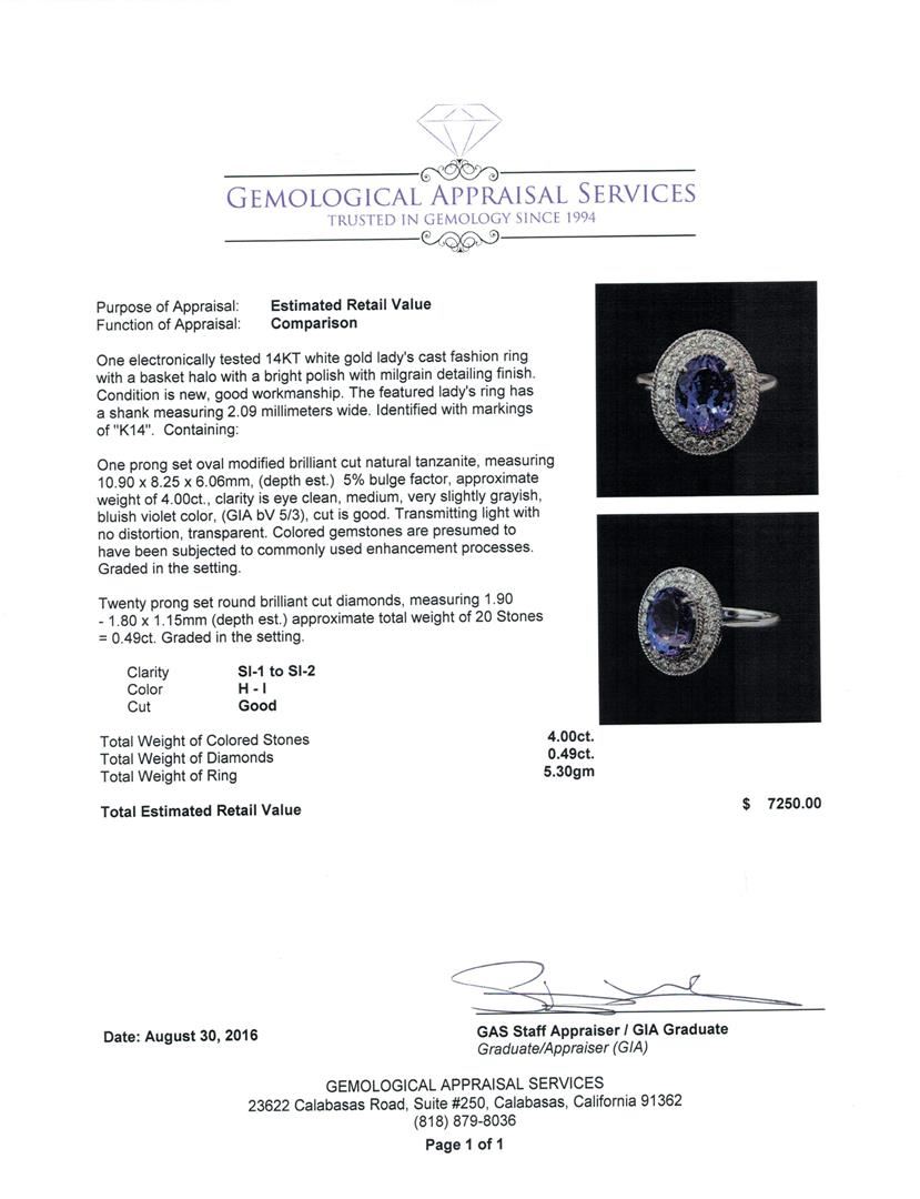 One electronically tested 14KT white gold lady's cast fashion ring with a basket halo with a bright polish with milgrain detailing finish. The featured lady's ring has a shank measuring 2.09 millimeters wide. Identified with markings of 'K14'. Condition is new, good workmanship. Containing: One prong set oval modified brilliant cut natural tanzanite, measuring 10.90 x 8.25 x 6.06mm, (depth est.) 5%. bulge factor, approximate weight of 4.00ct., clarity is eye clean, medium, very slightly grayish, bluish violet color, (GIA bV 5/3), cut is good. Transmitting light with no distortion, transparent. Colored gemstones are presumed to have been subjected to commonly used enhancement processes. Graded in the setting. Twenty prong set round brilliant cut diamonds, measuring 1.90 - 1.80 x 1.15mm (depth est.) approximate total weight of 20 Stones = 0.49ct. Graded in the setting. Clarity SI-1 to SI-2. Color: H - I Cut Good. Total Weight of Colored Stones 4.00ct. Total Weight of Diamonds 0.49ct. Total Weight of Ring 5.30gm. GAS Appraised at $7,250.00.