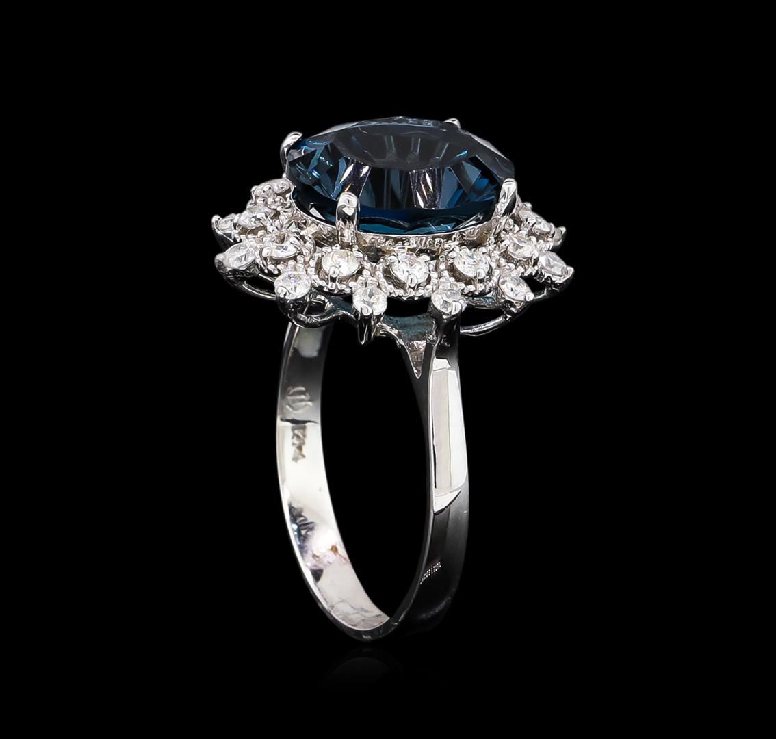 14K White Gold 4.00CT Topaz 0.70CT Diamond Ring. Description: Metal: 14k solid white gold. Face Measurements: 16 x 18mm. Size: 5. Shank Width: 2mm. Finish: bright polish. Total Item Weight: 4.5 grams. Markings: stamped 14K. Main Stone: Topaz. Quantity: 1. Shape: oval. Color: blue. Carat Total Weight: 4.00. Measurements: 9 x 11mm. Treatment: none. Setting: prong. Hue: blue. Saturation: moderately strong. Tone: medium dark. Clarity: type 2. Cut: very good. Secondary Stone: diamond. Quantity: 24. Shape: round. Color: white. Carat Total Weight: 0.70. Measurements: 2.00mm. Treatment: none. Setting: prong. Color Grade: H-I. Clarity: SI1-SI2. Cut: very good. Excellent Workmanship. Gemstones graded in the mounting. BHGL Appraised at $4,800.00.