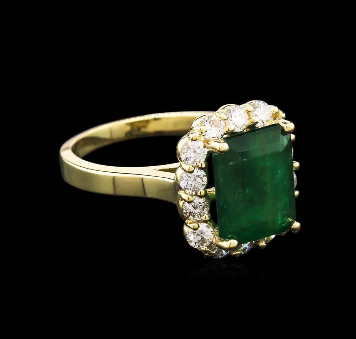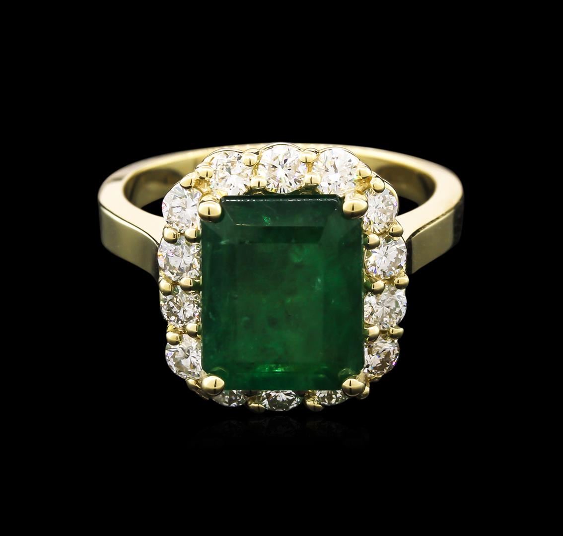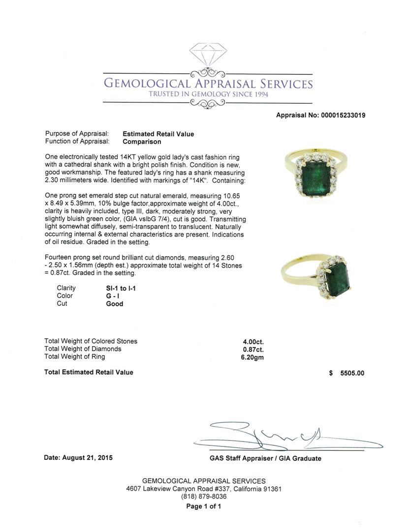 One electronically tested 14KT yellow gold lady's cast fashion ring with a cathedral shank with a bright polish finish. The featured lady's ring has a shank measuring 2.30 millimeters wide. Identified with markings of "14K". Condition is new, good workmanship. Containing: One prong set emerald step cut natural emerald, measuring 10.65 x 8.49 x 5.39mm, 10% bulge factor, approximate weight of 4.00ct., clarity is heavily included, type III, dark, moderately strong, very slightly bluish green color, (GIA vslbG 7/4), cut is good. Transmitting light somewhat diffusely, semi-transparent to translucent. Naturally occurring internal & external characteristics are present. Indications of oil residue. Graded in the setting. Fourteen prong set round brilliant cut diamonds, measuring 2.60 - 2.50 x 1.56mm (depth est.) approximate total weight of 14 Stones = 0.87ct. Graded in the setting. Clarity: SI-1 to I-1. Color: G - I. Cut Good. Total Weight of Colored Stones 4.00ct. Total Weight of Diamonds 0.87ct. Total Weight of Ring 6.20gm. GAS Appraised at $5,505.00.
