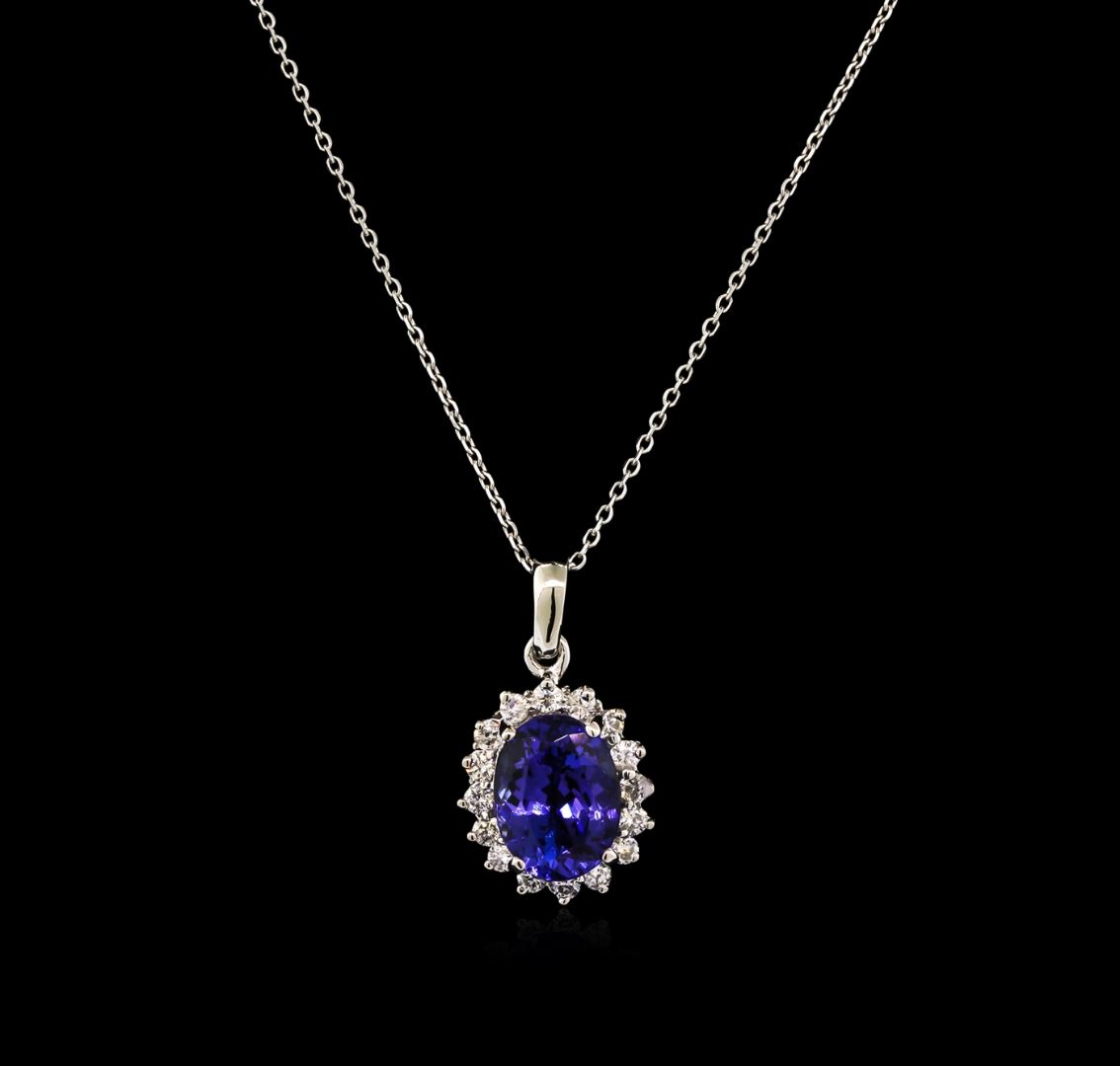 One electronically tested 14KT white gold lady's combination cast & assembled fashion pendant & chain 18.0" long, 1mm diamond cut cable link with a lobster claw clasp with a halo with a bright polish finish. Identified with markings of "14K". Condition is new, good workmanship. Containing: One prong set oval modified brilliant cut natural tanzanite, measuring 10.98 x 8.30 x 5.96mm, approximate weight of 4.00ct., clarity is eye clean, type I, medium dark, very slightly grayish, violetish blue color, (GIA vB 6/3), cut is good. Transmitting light with no distortion, transparent. Colored gemstones are presumed to have been subjected to commonly used enhancement processes. Graded in the setting. Sixteen prong set round brilliant cut diamonds, measuring 2.10 - 2.00 x 1.23mm (depth est.) approximate total weight of 16 Stones = 0.50ct. Graded in the setting. Clarity: SI-2 to I-1. Color: H - I. Cut Good. Total Weight of Colored Stones 4.00ct. Total Weight of Diamonds 0.50ct. Total Weight of Pendant & Chain 5.00gm. GAS Appraised at $7,185.00.