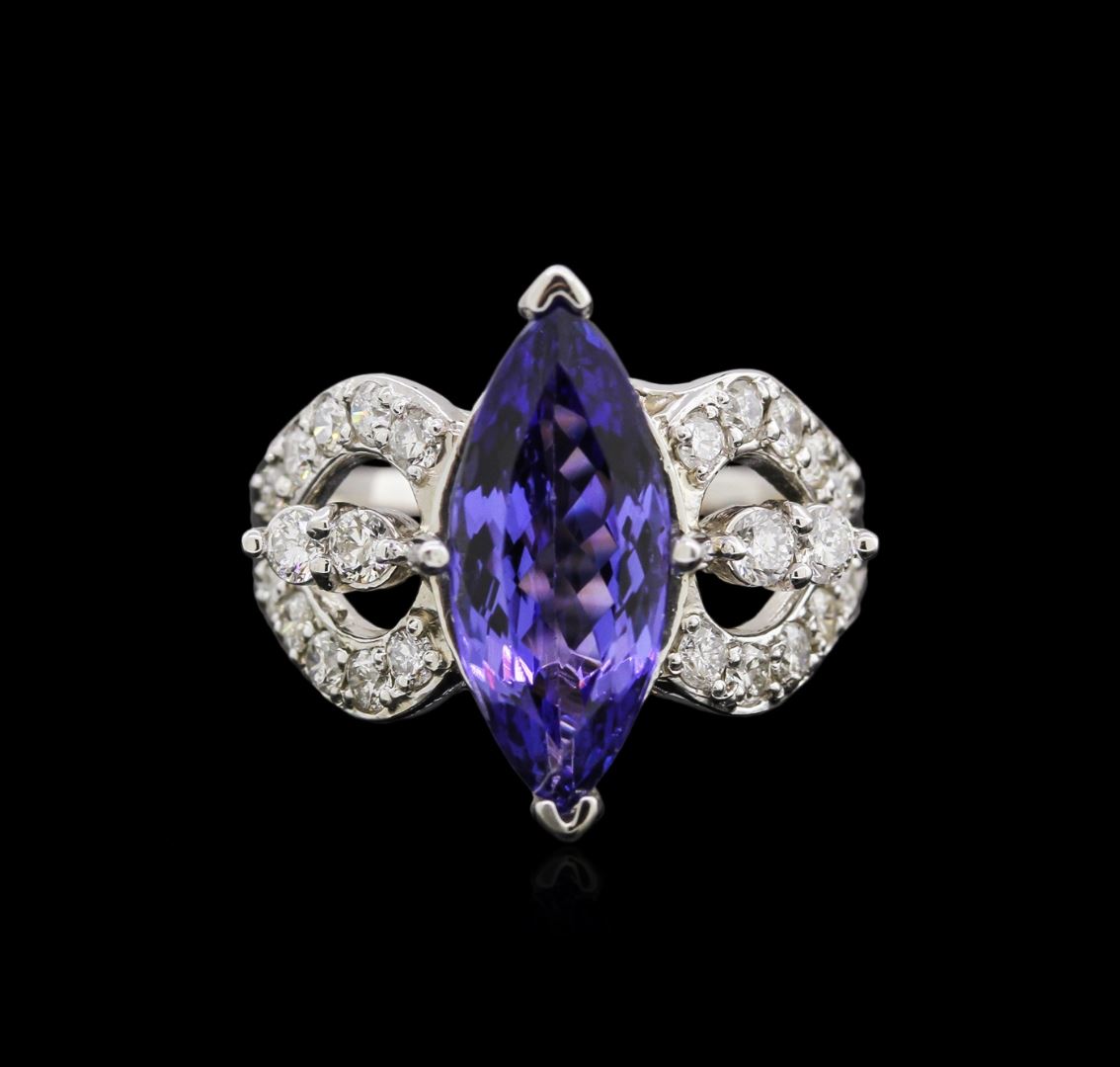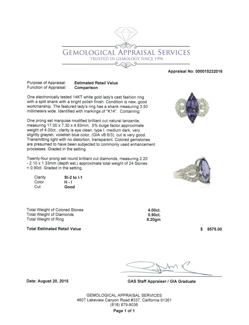 One electronically tested 14KT white gold lady's cast fashion ring with a split shank with a bright polish finish. The featured lady's ring has a shank measuring 3.50 millimeters wide. Identified with markings of "K14". Condition is new, good workmanship. Containing: One prong set marquise modified brilliant cut natural tanzanite, measuring 17.00 x 7.30 x 4.83mm, 5% bulge factor, approximate weight of 4.00ct., clarity is eye clean, type I, medium dark, very slightly grayish, violetish blue color, (GIA vB 6/3), cut is very good. Transmitting light with no distortion, transparent. Colored gemstones are presumed to have been subjected to commonly used enhancement processes. Graded in the setting. Twenty-Four prong set round brilliant cut diamonds, measuring 2.20 - 2.10 x 1.33mm (depth est.) approximate total weight of 24 Stones = 0.90ct. Graded in the setting. Clarity: SI-2 to I-1. Color: H - I. Cut Good. Total Weight of Colored Stones 4.00ct. Total Weight of Diamonds 0.90ct. Total Weight of Ring 8.20gm. GAS Appraised at $8,575.00.