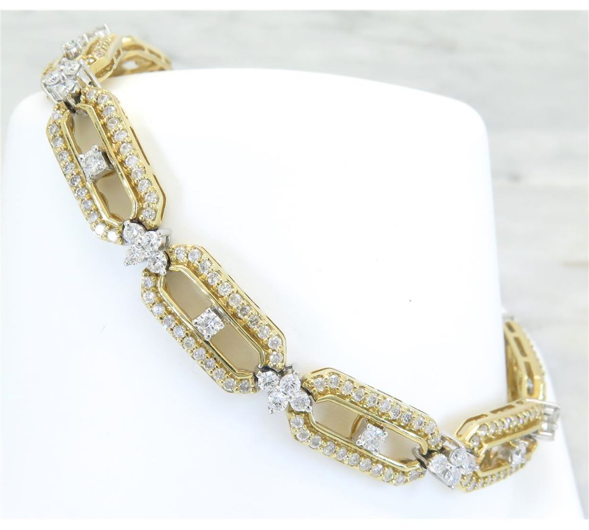 One tested 14K yellow gold diamond bracelet. Containing: 268 Round Brilliant Cut Diamonds. Clarity: I, Color: H-K. Approximate total diamond weight: 4.00CTW. All diamonds are graded in the mounting unless otherwise stated. Weight of bracelet: 19.9 grams, Size: 7" Long.