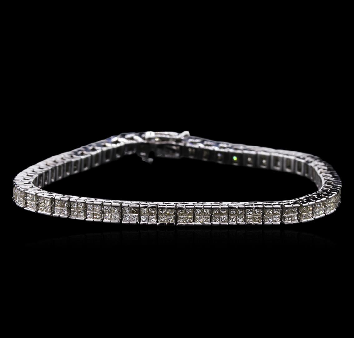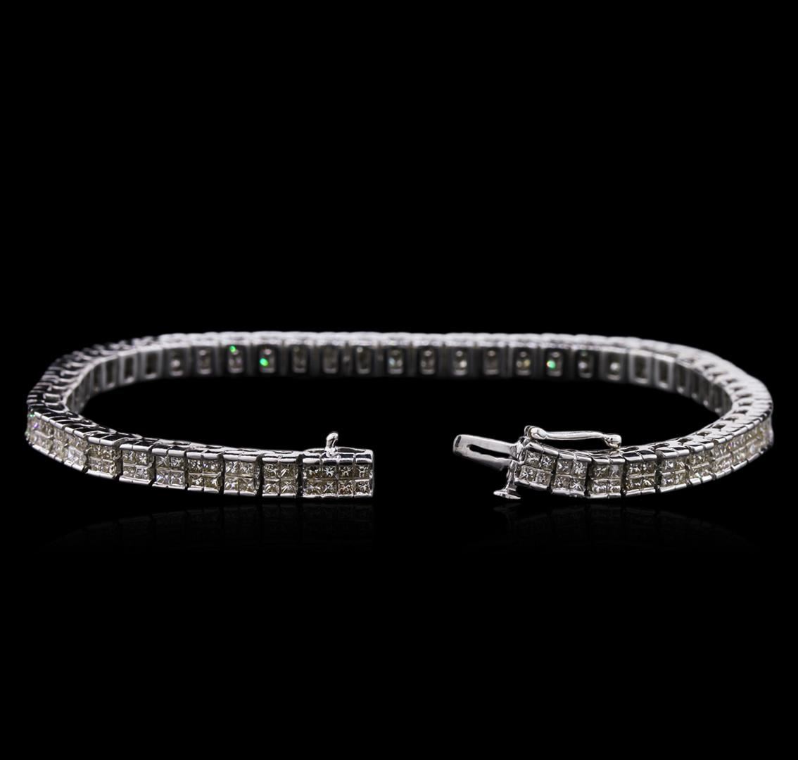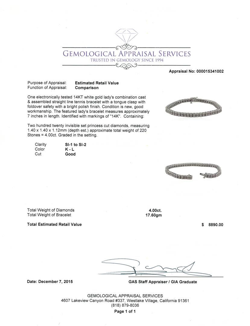 One electronically tested 14KT white gold lady's combination cast & assembled straight line tennis bracelet with a tongue clasp with foldover safety with a bright polish finish. The featured lady's bracelet measures approximately 7 inches in length. Identified with markings of "14K". Condition is new, good workmanship. Containing: Two Hundred Twenty invisible set princess cut diamonds, measuring 1.40 x 1.40 x 1.12mm (depth est.) approximate total weight of 220 Stones = 4.00ct. Graded in the setting. Clarity: SI-1 to SI-2. Color: K - L. Cut Good. Total Weight of Diamonds 4.00ct. Total Weight of Bracelet 17.60gm. GAS Appraised at $8,890.00.